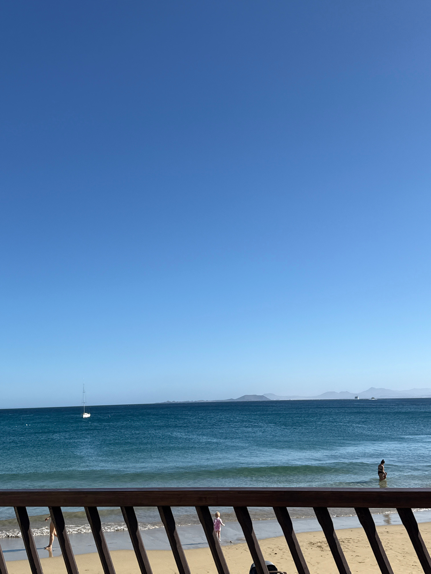 The image depicts a sunny day at Playa Blanca, Spain. The right side of the view is partially obscured by a wooden railing. Beyond the railing, a sandy beach meets the blue ocean. Several people are o…read more