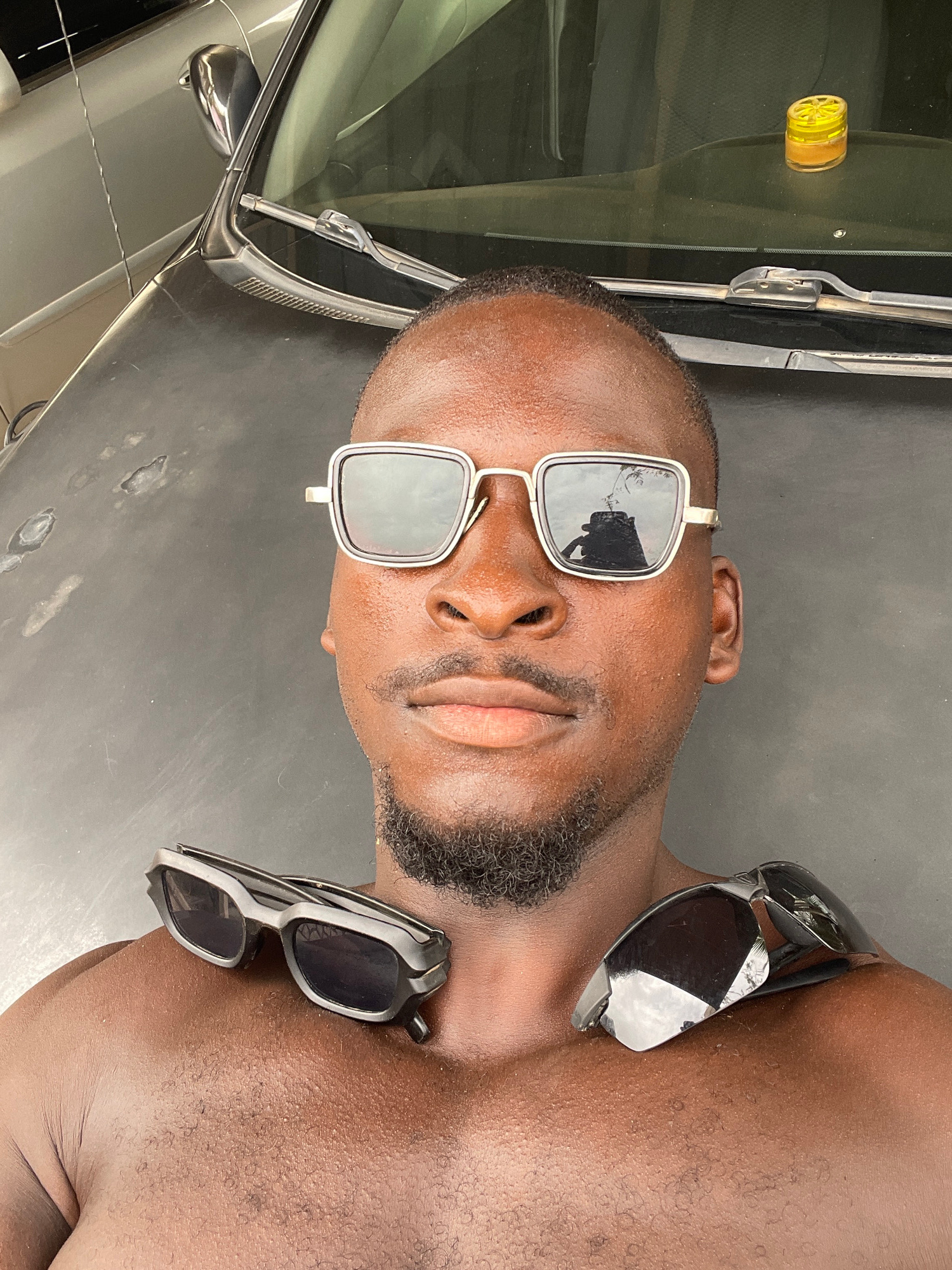 A close-up shot shows a dark-skinned man lying on a black car's hood. He has a trimmed beard and is wearing square-framed sunglasses. Two additional pairs of sunglasses are placed on his neck and shou…read more