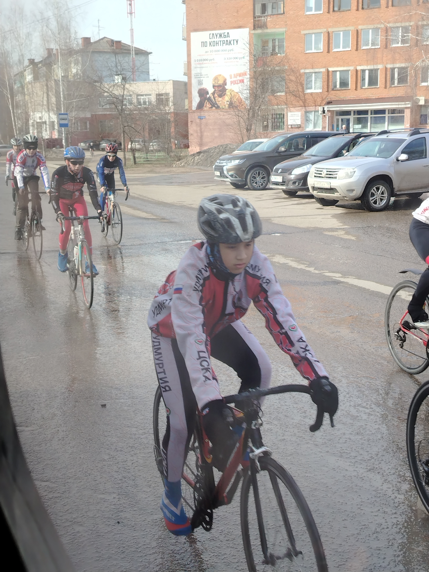 A group of young cyclists are riding on a wet asphalt road in Noviy, Russia. The cyclist in the foreground wears a white, red, and black jacket with "ЦСКА Удмуртия" written in Cyrillic on the sleeves…read more