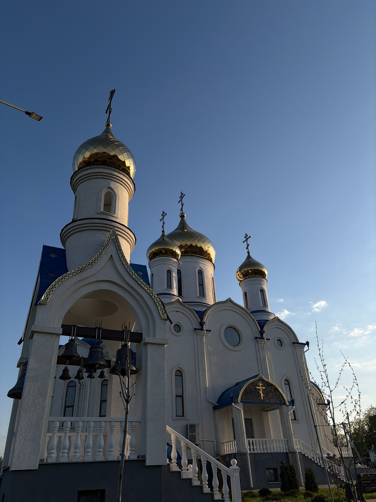 This image captures a low-angle, upward view of an ornate Orthodox church, located in Novopokrovskaya, Russia. The church is predominantly white with striking golden onion domes, each topped with a cr…read more