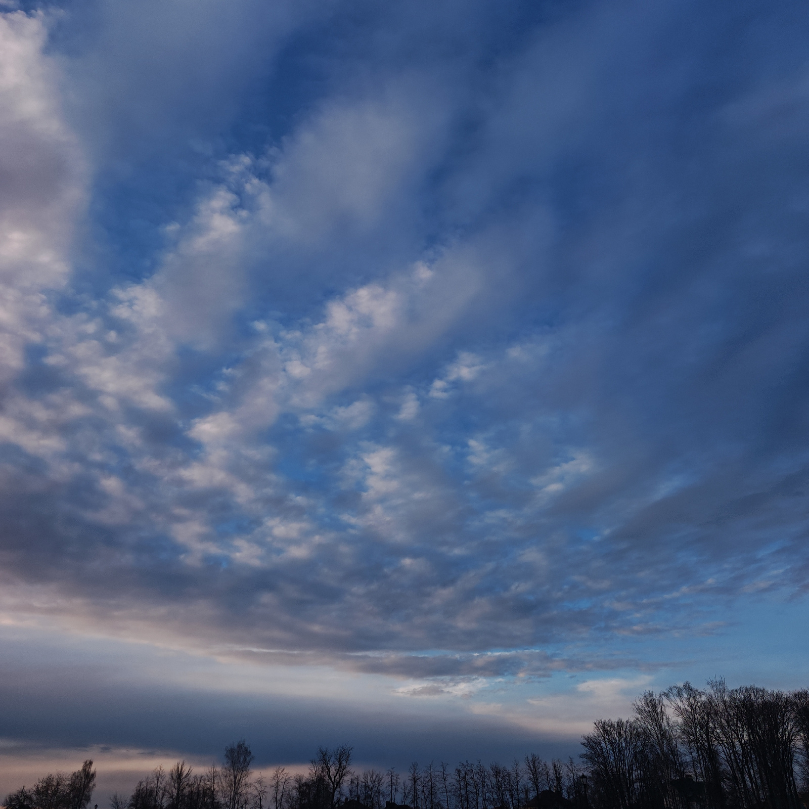 The image depicts a sky with varied cloud formations and colors, transitioning from a lighter blue at the top to darker, more ominous tones near the horizon. A row of bare trees is visible at the bott…read more
