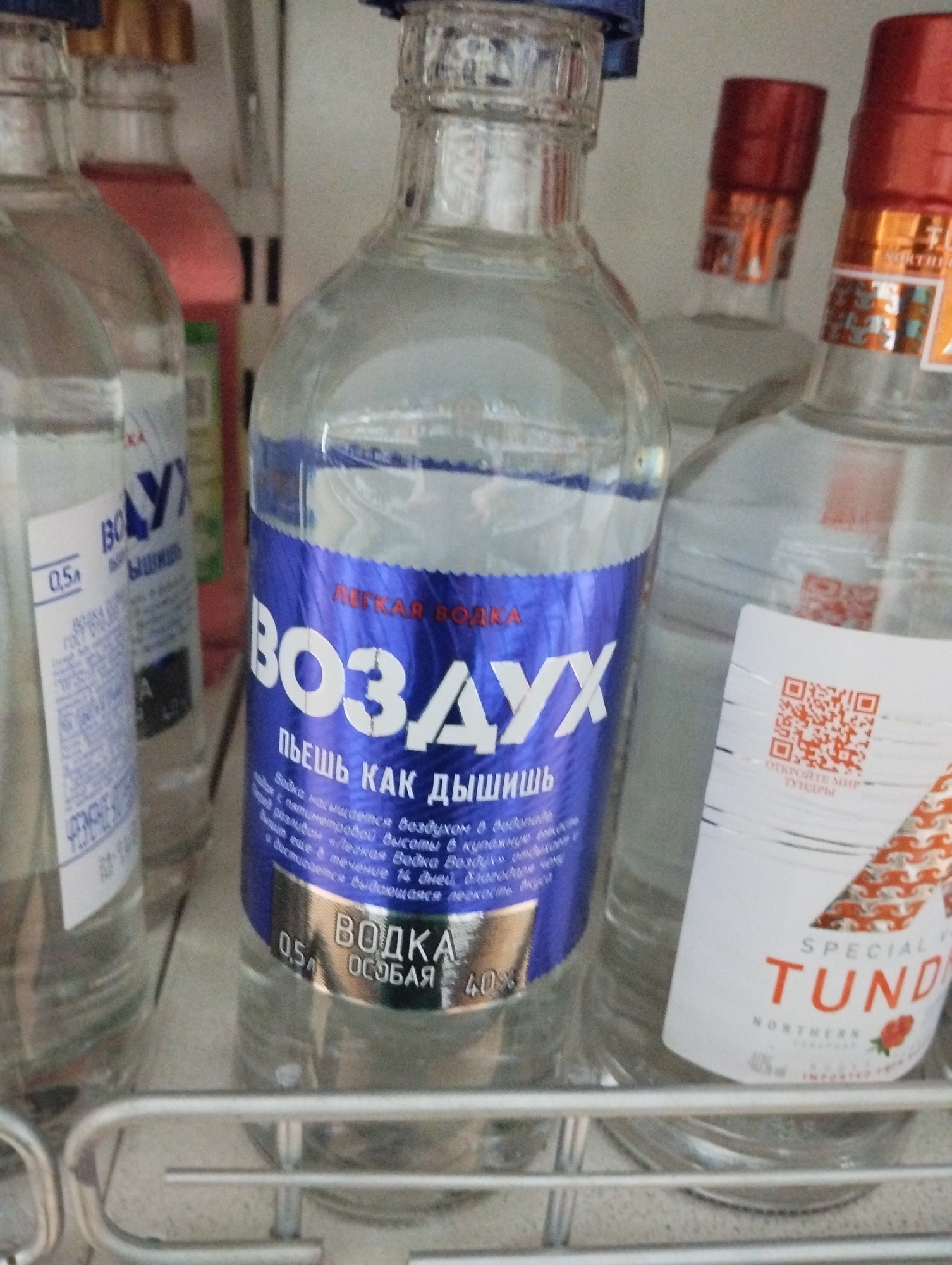 A close-up shot depicts several bottles of vodka displayed on a metal shelf. The central bottle features a blue label with white Cyrillic text, prominently displaying "ВОЗДУХ" and "ПЬЕШЬ КАК ДЫШИШЬ",…read more