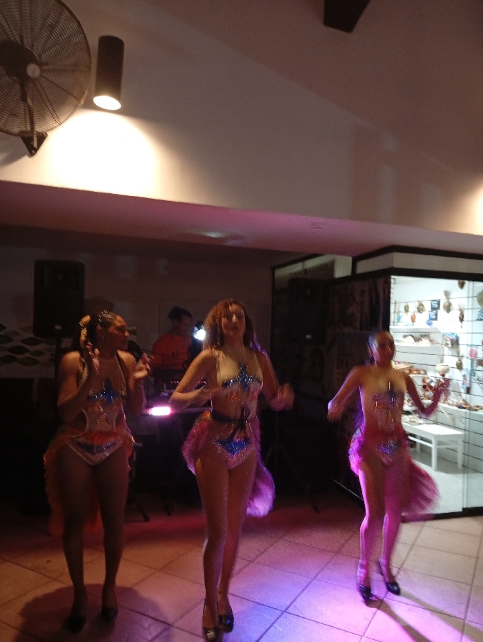 This image captures an indoor live performance at a venue in Playa El Agua, Venezuela. Three adult females are featured prominently in the foreground, dressed in elaborate, multi-colored, sequined two…read more