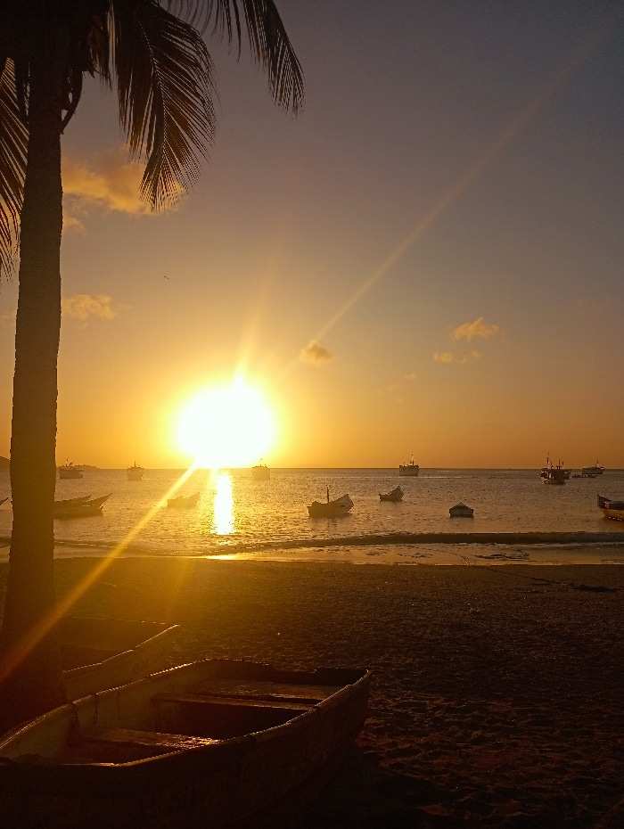 A tranquil beach scene unfolds under a vibrant sunset. A tall palm tree stands silhouetted to the left. Several small boats dot the calm water, reflecting the sun's golden light. Two empty rowboats re…read more