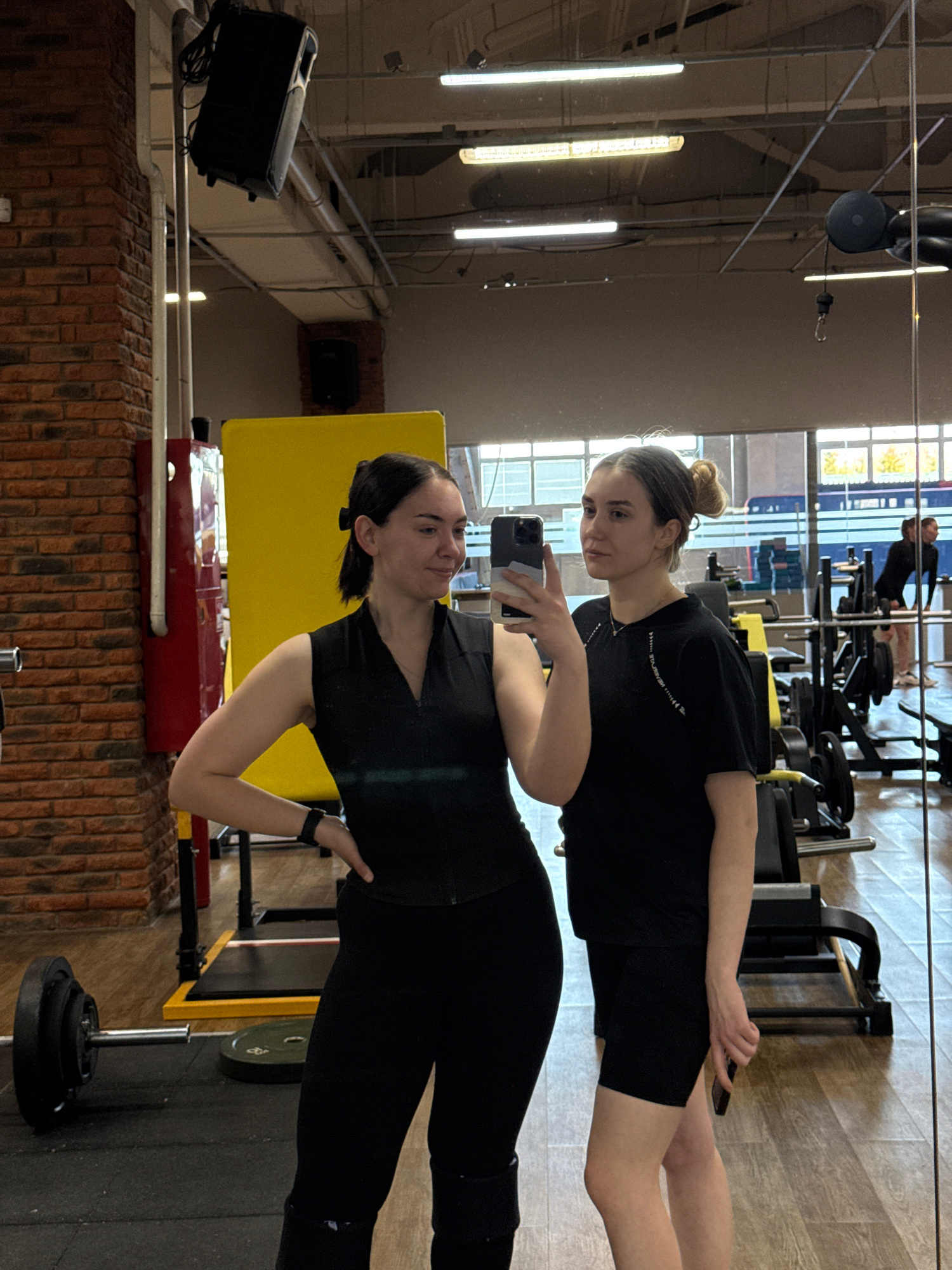 Two women are visible in a gym, reflected in a large mirror. One woman is holding a phone and appears to be taking a selfie, with the other woman in the frame. The woman taking the selfie is wearing b…read more
