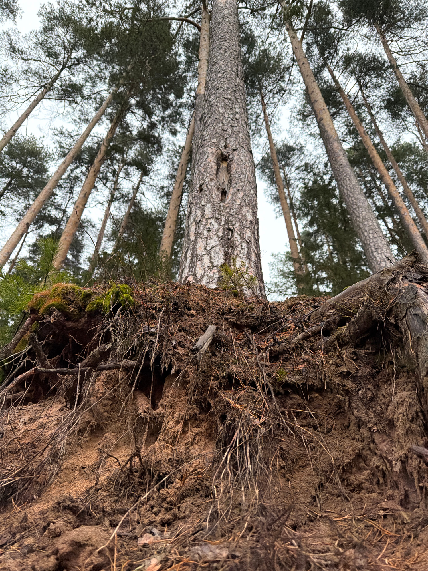 The image depicts an eroded section of earth with exposed roots and soil on the left side of the frame. To the right, several tall, slender trees stretch upwards towards the sky. The trees have texturβ¦read more