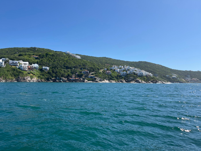 A picturesque scene displays a tranquil body of water against a verdant hillside dotted with white buildings. The hillside, covered in lush green trees, rises gently from the water's edge. The blue sk…read more