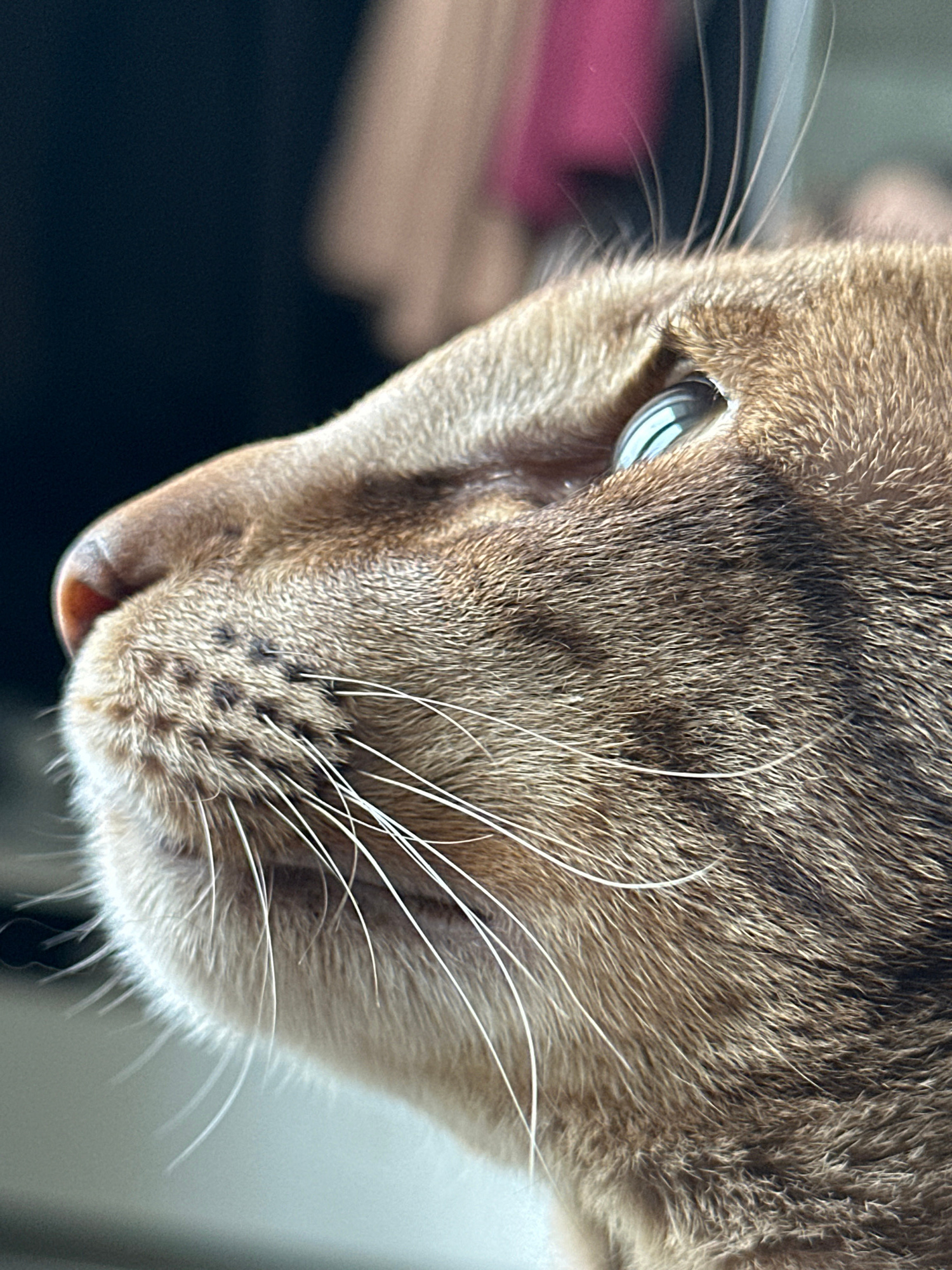 A very close-up, detailed shot captures the right side of a cat's head, angled slightly downwards. The cat's fur is a short, dense tabby pattern, primarily composed of shades of brown, tan, and darker…read more