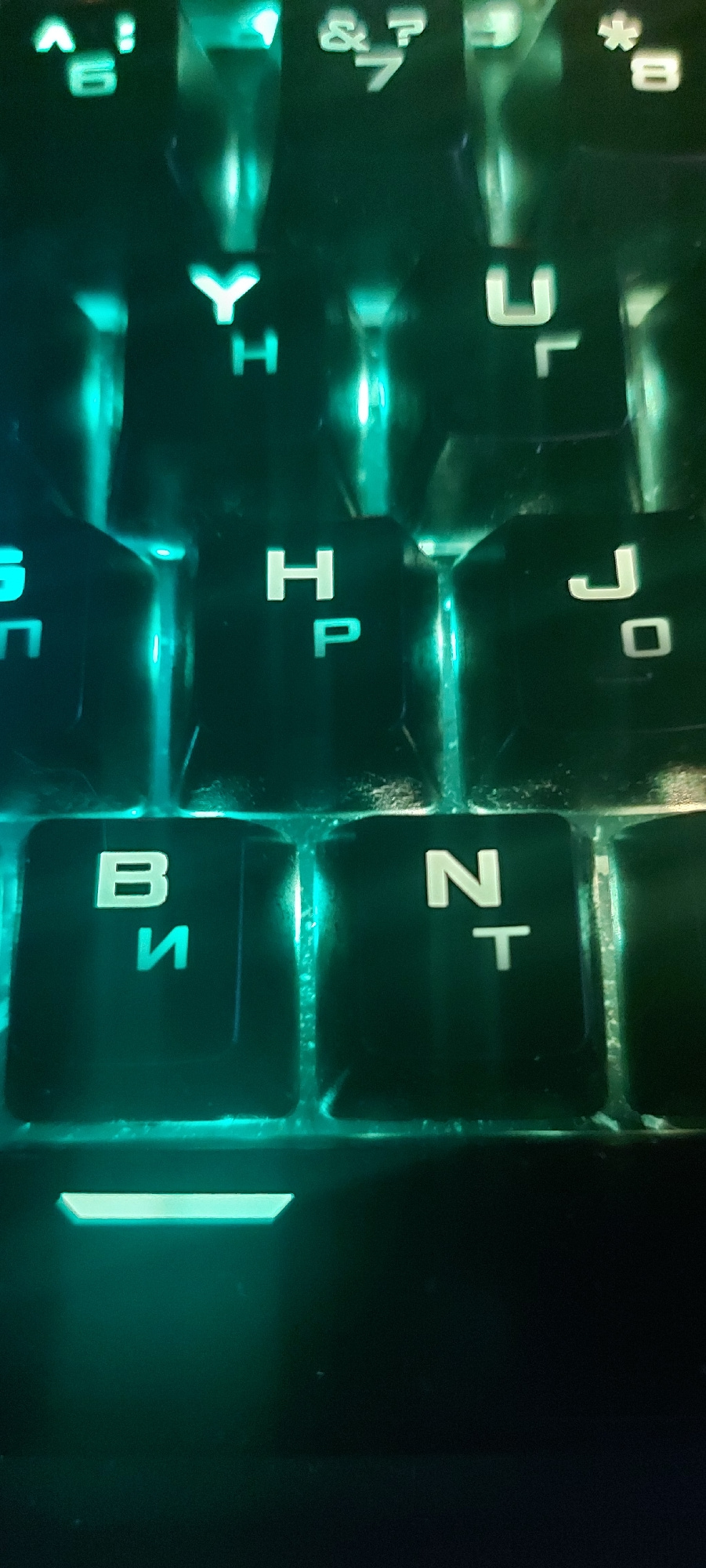 The image shows a close-up view of a backlit keyboard, likely a mechanical keyboard with customizable RGB lighting. The keycaps are black with white legends. The camera angle is slightly skewed. The k…read more