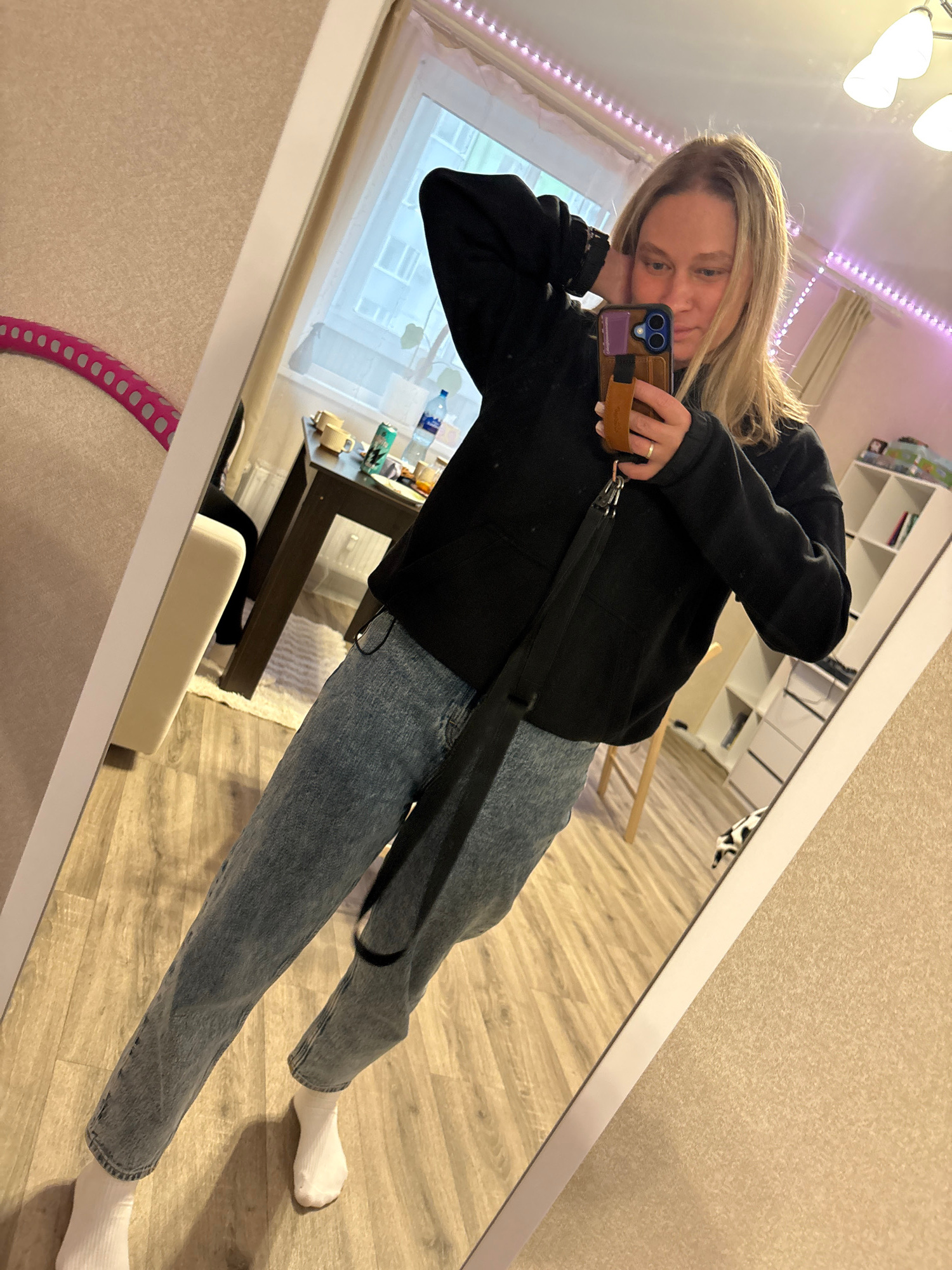 A woman is taking a mirror selfie indoors. She has blond hair, wears a black jacket, blue jeans, and white socks. She holds a smartphone in her right hand and rests her left hand on her face. The back…read more