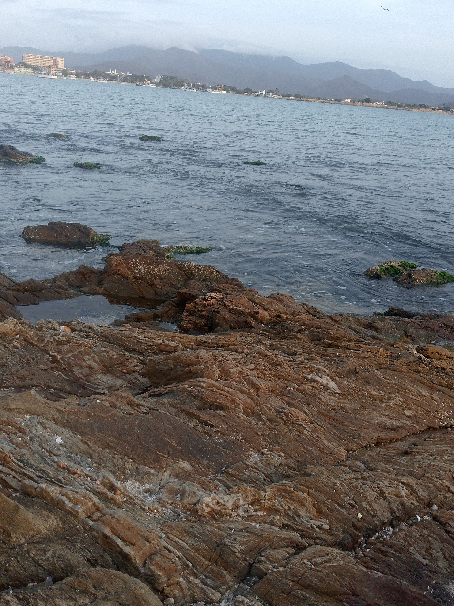 The image captures a rocky shoreline in Juan Griego, Venezuela. Brown and tan rocks dominate the foreground, displaying a layered pattern. A small pool of water is nestled among the rocks. The calm oc…read more