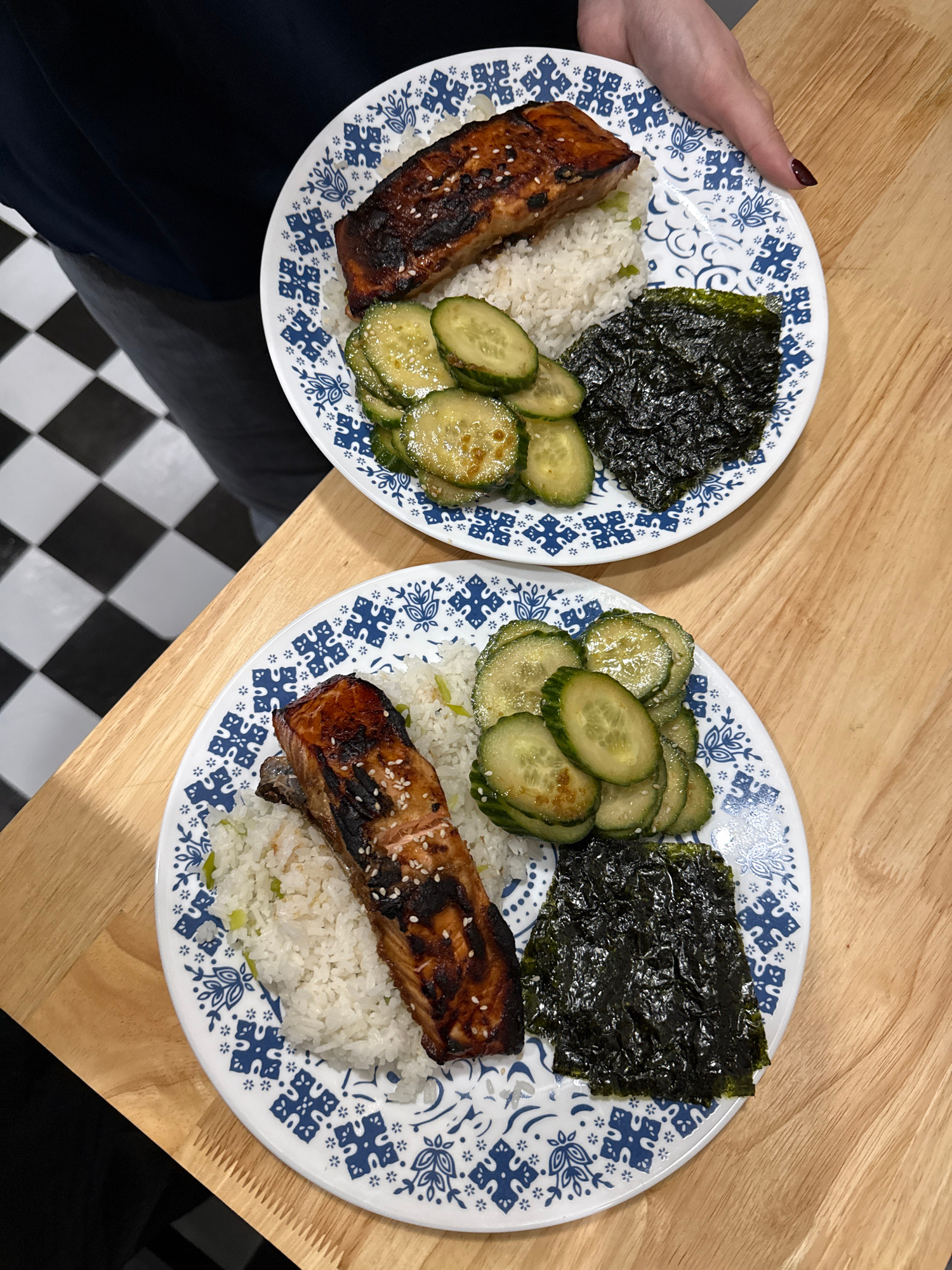 Here is a detailed description of the image: The image shows two plates of food on a light brown wooden table. The plates are white with a blue floral pattern. Each plate contains a portion of rice,…read more