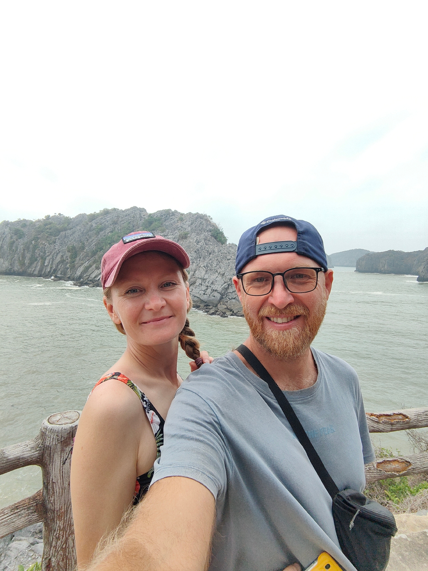 A selfie captures a man and a woman on a lookout point in Hải Phòng, Vietnam. The woman on the left, is light-skinned with blonde hair in a braid, wearing a dark-floral-print top and a pink baseball c…read more