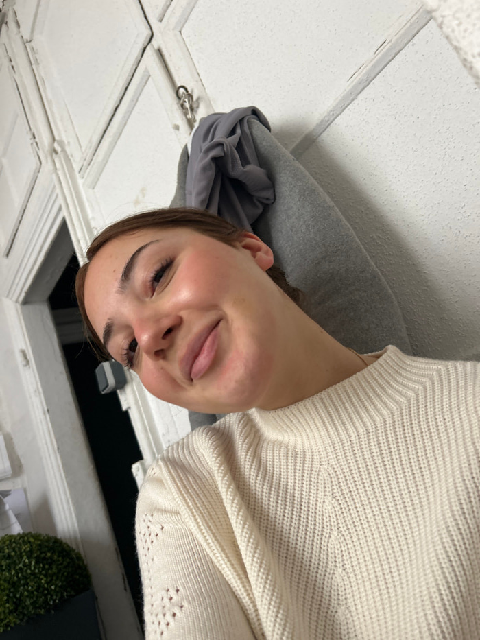 This image captures a close-up of a young adult female in an indoor setting in Strasbourg, France. The female subject, appearing to be in her late teens or early twenties, has dark brown hair pulled b…read more