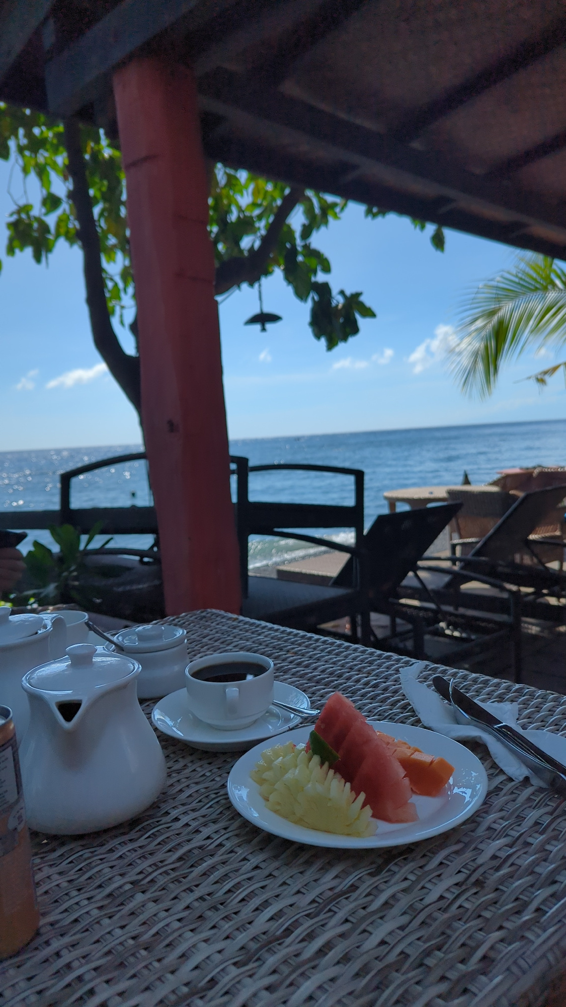 The image shows a breakfast scene with a plate of cut fruit (watermelon, papaya, and pineapple), a cup of coffee, and a white ceramic pitcher on a woven table. In the background, the ocean and a blue…read more