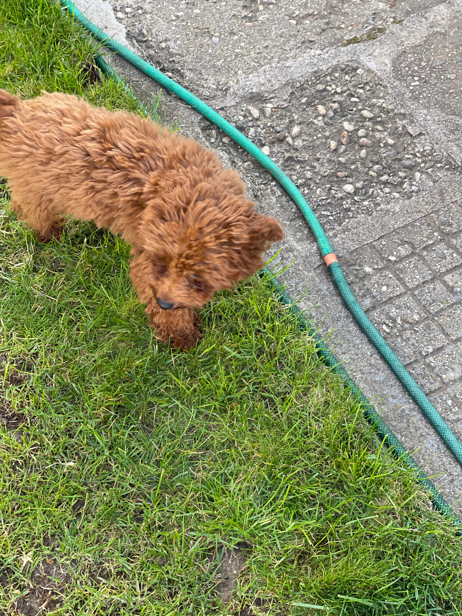 The image captures an outdoor scene from a top-down perspective, featuring a small, brown, fluffy dog, a green garden hose, concrete paving, and green grass. The main subject is a reddish-brown, curl…read more