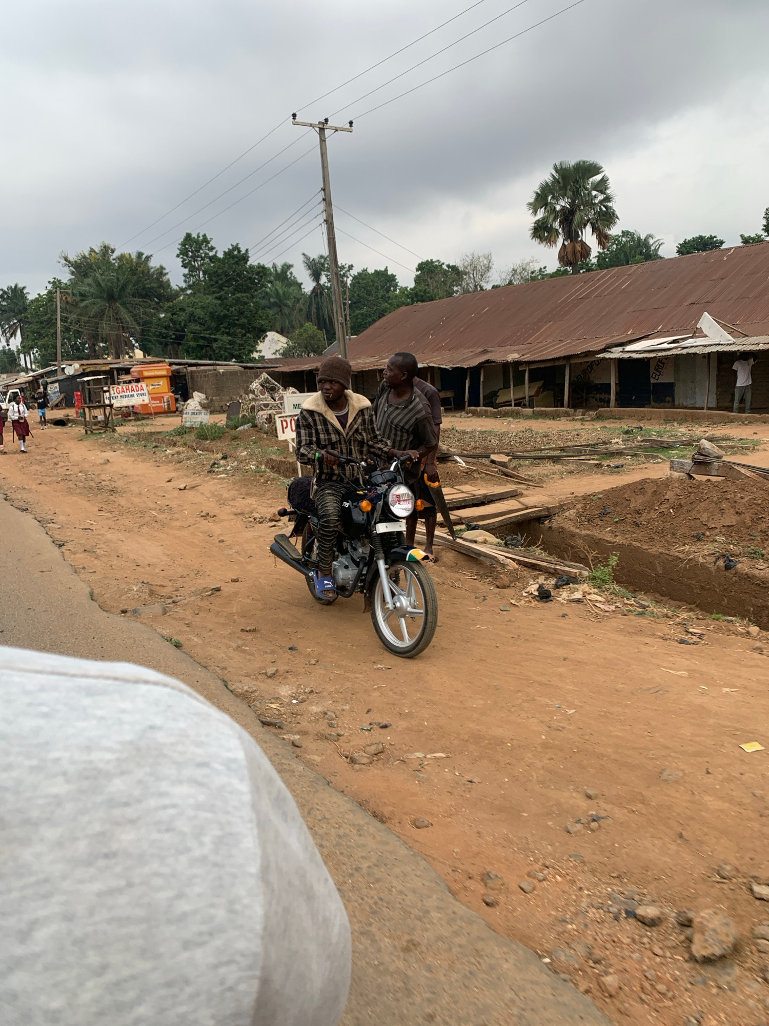 Two men are riding on a motorcycle on a dirt road in what appears to be Maigizo, Nigeria. The man in front wears a striped shirt, while the other man wears a plaid shirt and a hat. Buildings line the…read more