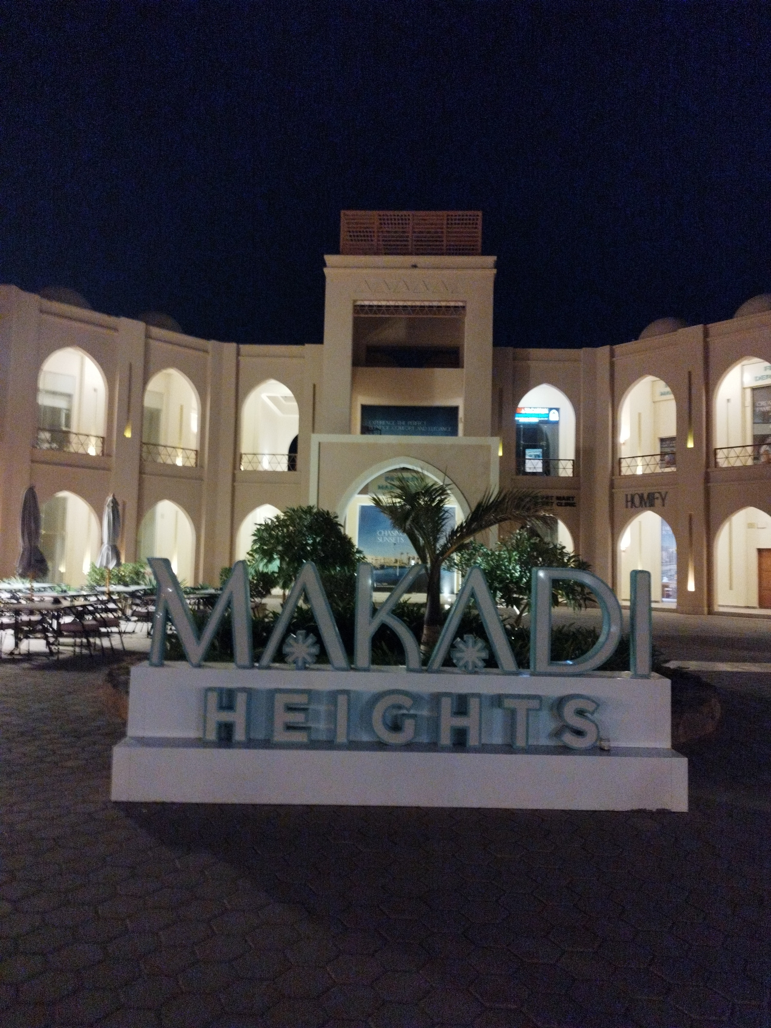 The image depicts a nighttime scene at Makadi Heights in Safaga, Egypt. In the foreground, a sign reading "MAKADI HEIGHTS" is prominently displayed, with greenery interspersed between the letters. Beh…read more
