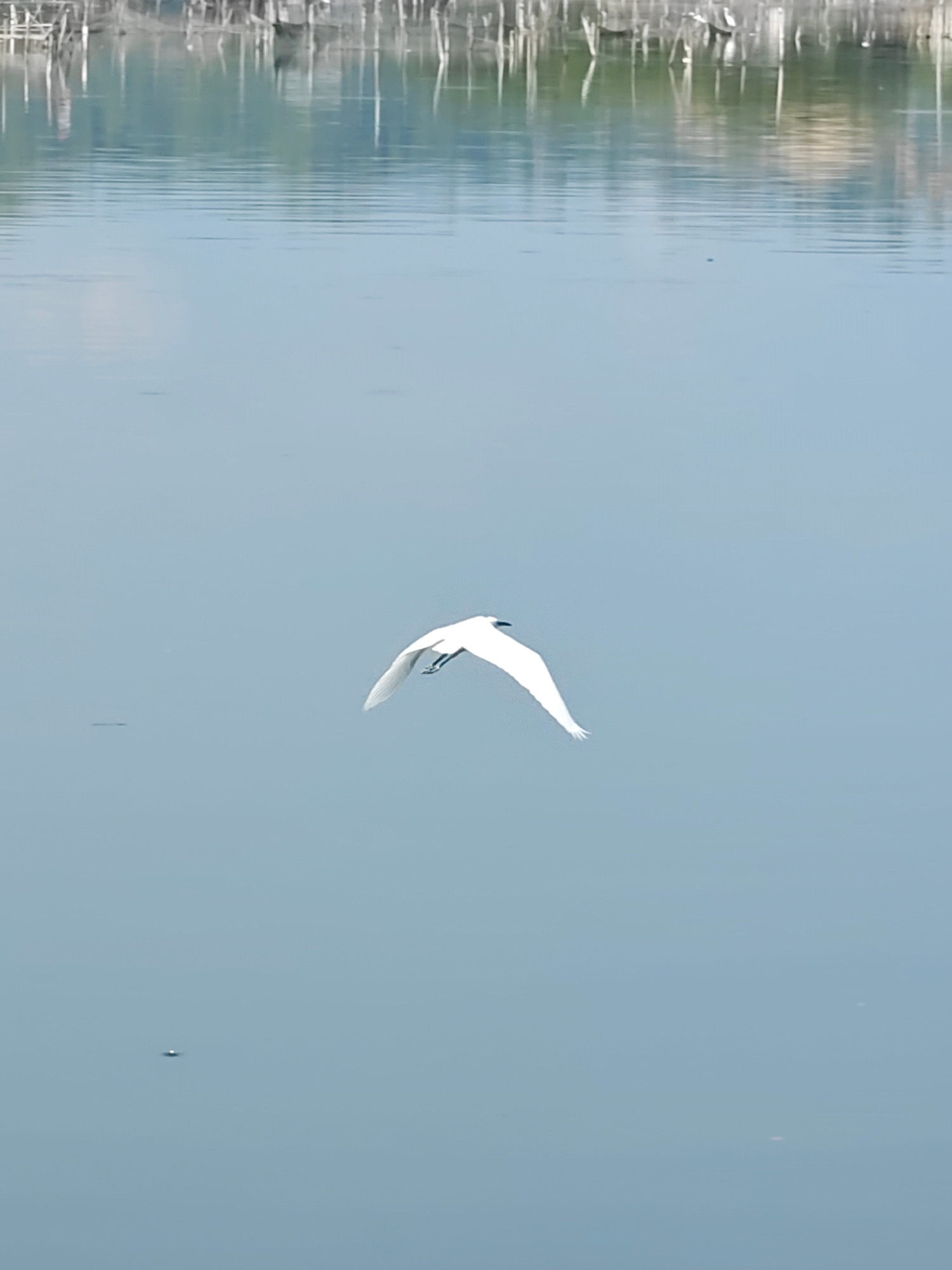 A white bird flies over a body of water. In the background are the reflections of trees or structures in the water. The location is presumed to be in the city of Lhokseumawe, Indonesia.