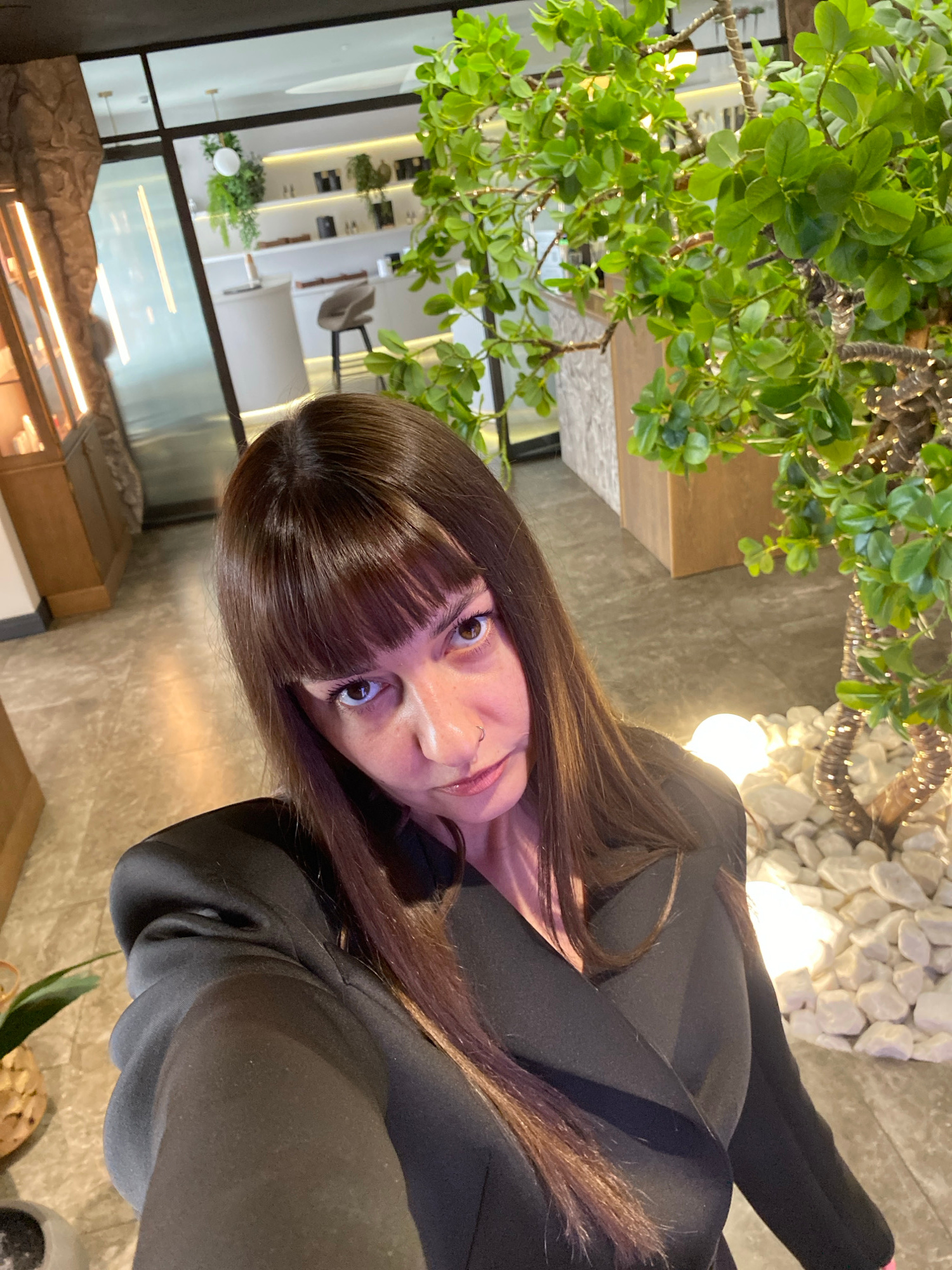 An image, rotated ninety degrees to the left, features a young woman posing for a close-up within an indoor setting. She has long, straight dark brown hair with a blunt fringe covering her forehead. H…read more