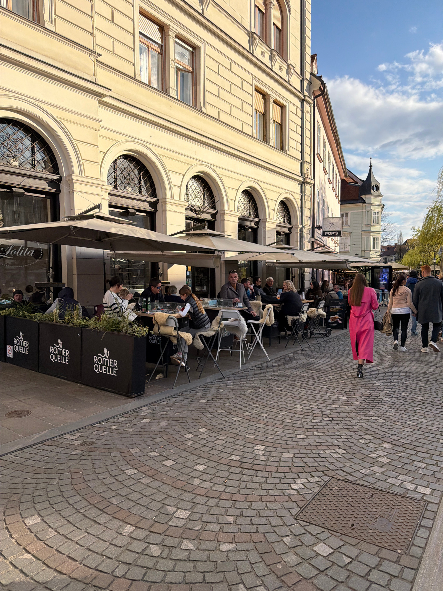 The image shows an outdoor cafe scene in Ljubljana, Slovenia. People are seated at tables under a shaded awning, enjoying food and drinks. The cafe has planters with the logo "Romer Quelle" along its…read more