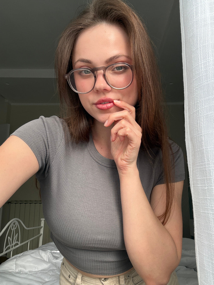 A single female subject is depicted in a close-up, waist-up view within an indoor residential setting in Scafati, Italy. She possesses long, light brown hair and wears clear-framed glasses. Her attire…read more