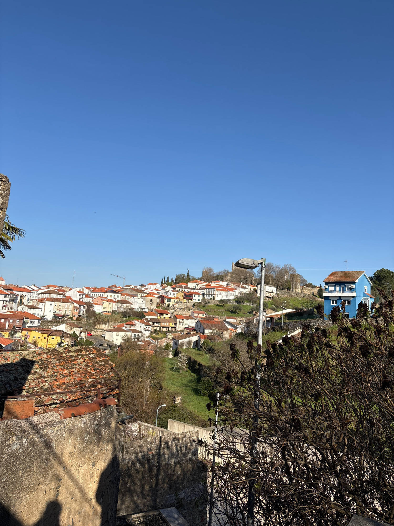 The image presents an elevated panoramic view of the city of Bragança, Portugal, under a clear, bright blue sky. In the immediate foreground, a rough-textured concrete retaining wall occupies the low…read more