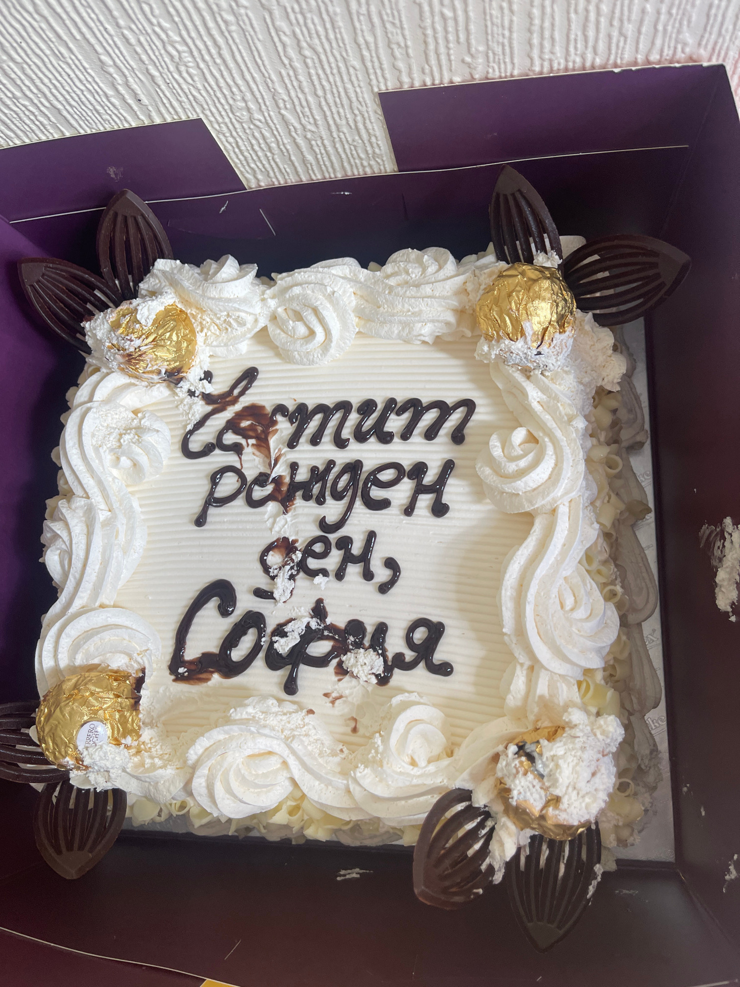 A square cake in a purple cardboard box is positioned in Maidstone, United Kingdom, likely indoors on a table. The cake is adorned with white frosting swirls, chocolate decorations, and Ferrero Rocher…read more
