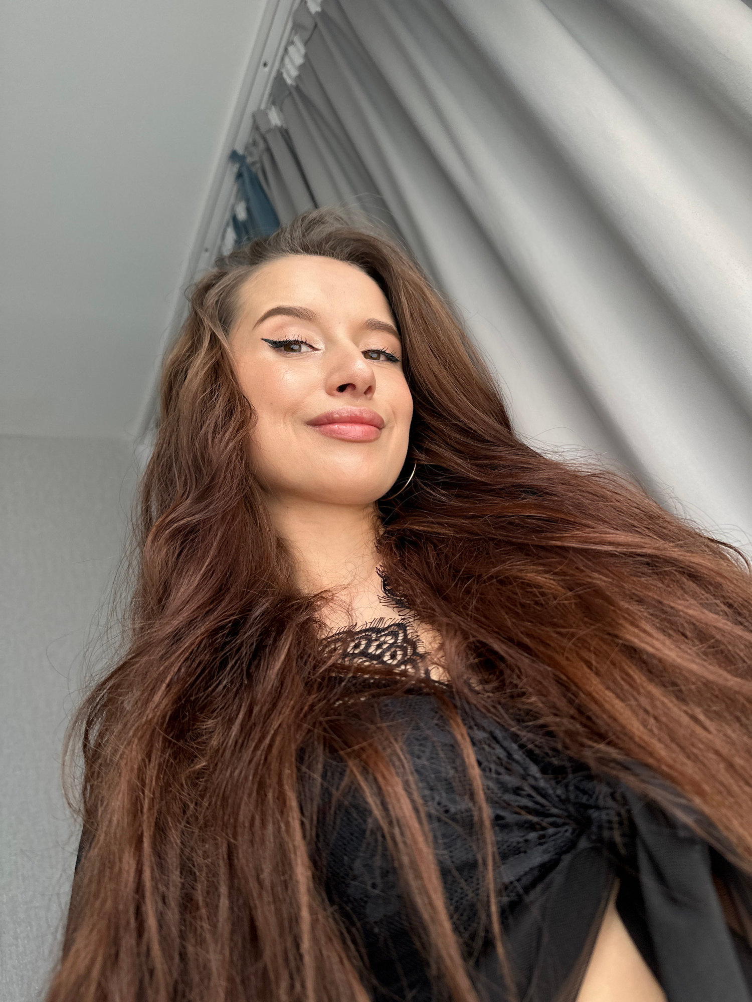 A portrait-style photograph captures a young woman, likely in her 20s or early 30s, in an indoor setting. The image is oriented such that her head is positioned on the left side of the frame, with her…read more