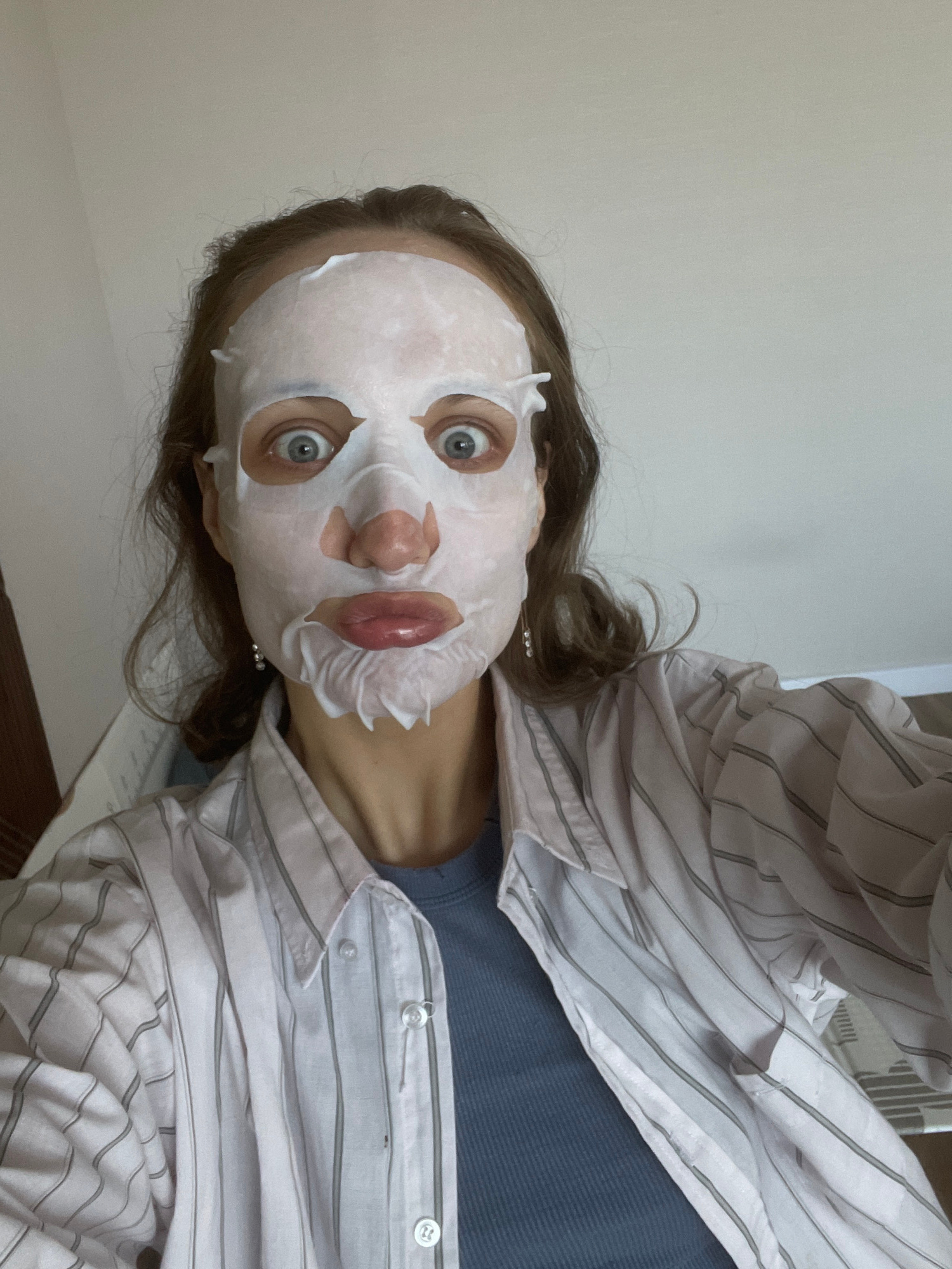 A woman is seen from a close, tilted, high-angle perspective. She is wearing a sheet mask, which is a white, non-woven fabric infused with serum, fitted over her face with cutouts for the eyes and nos…read more
