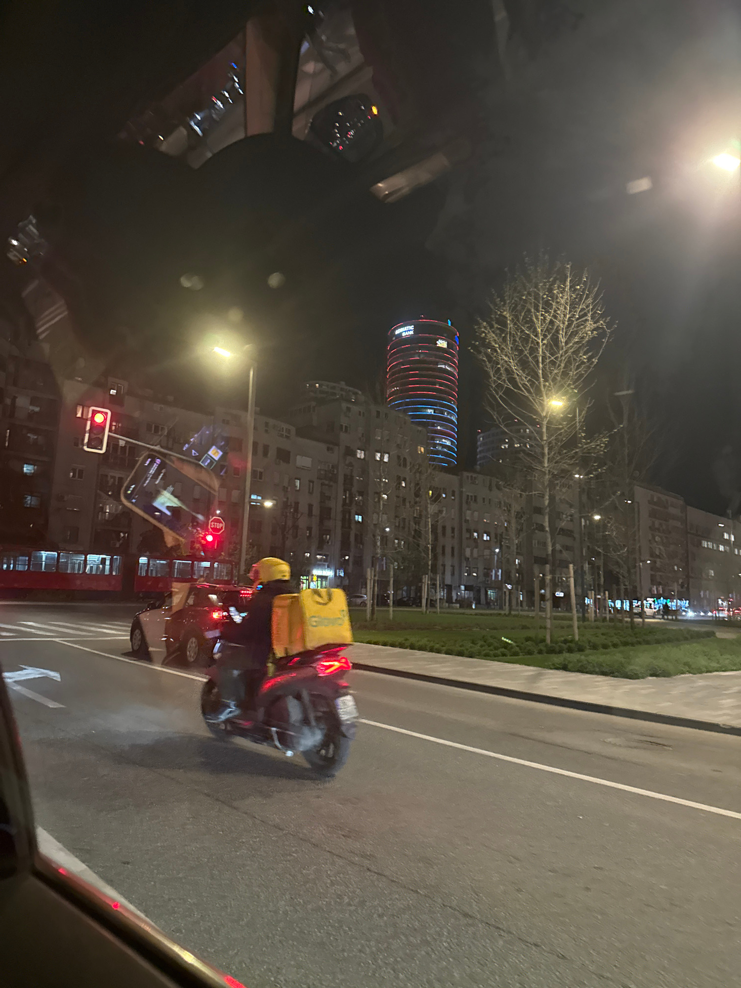 The image shows a night scene in Belgrade, Serbia, viewed from inside a car. A delivery person on a scooter with a yellow delivery backpack is stopped at a red traffic light. Cars are stopped behind t…read more