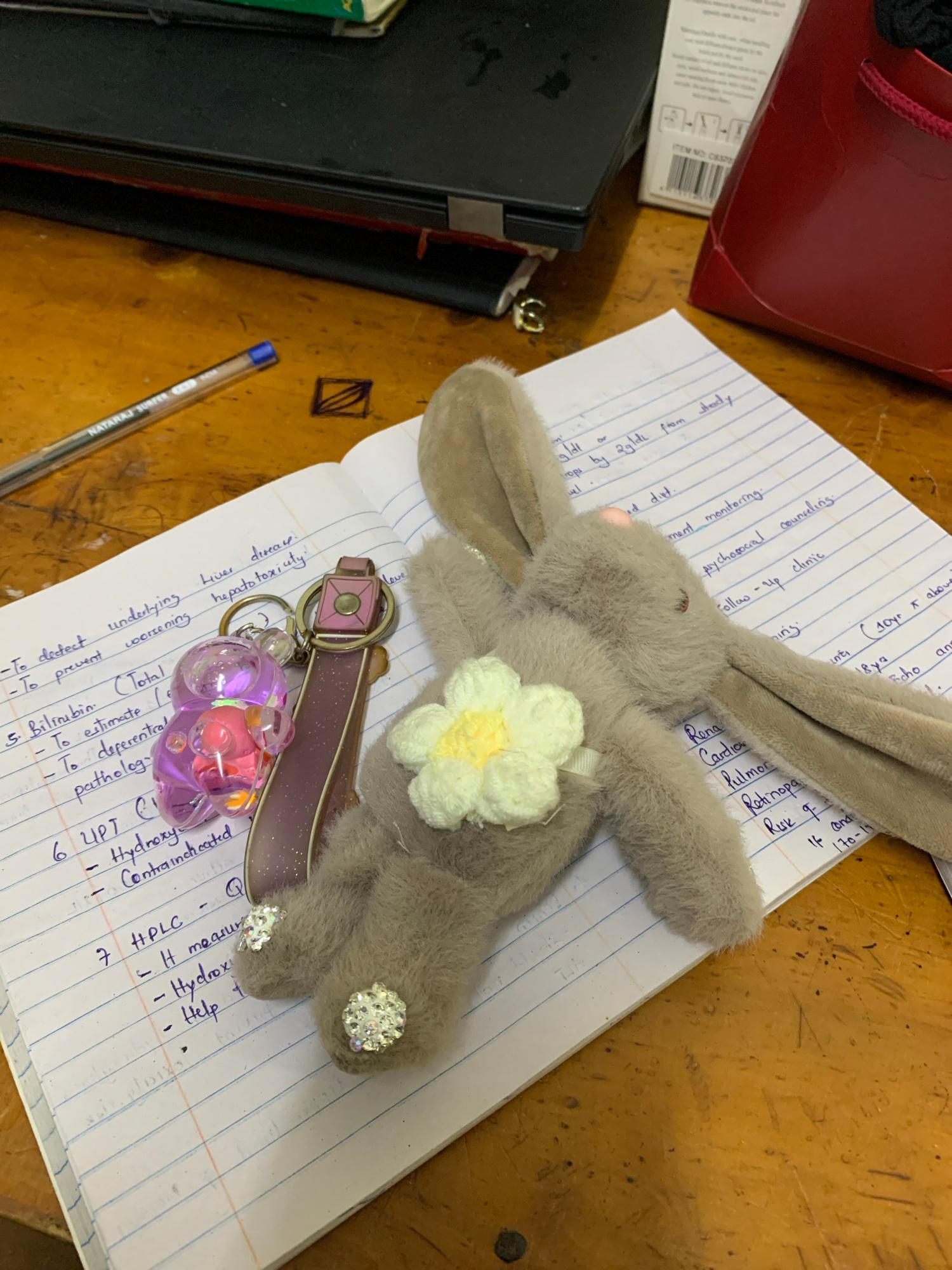 The image shows a cluttered desk. On top of a lined notebook filled with handwritten notes is a plush, gray bunny toy with a white flower pinned to its chest and decorative jewels on its paws. A purp…read more