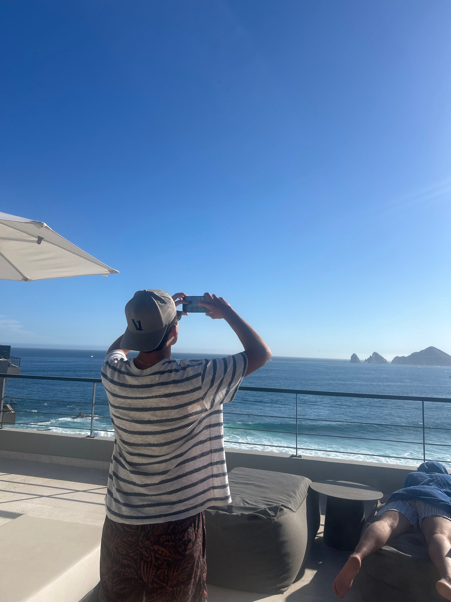 The image shows a man on a balcony in Cabo San Lucas, Mexico, taking a picture with his phone. The balcony overlooks the ocean and a rocky coastline. The man is wearing a striped shirt, patterned shor…read more