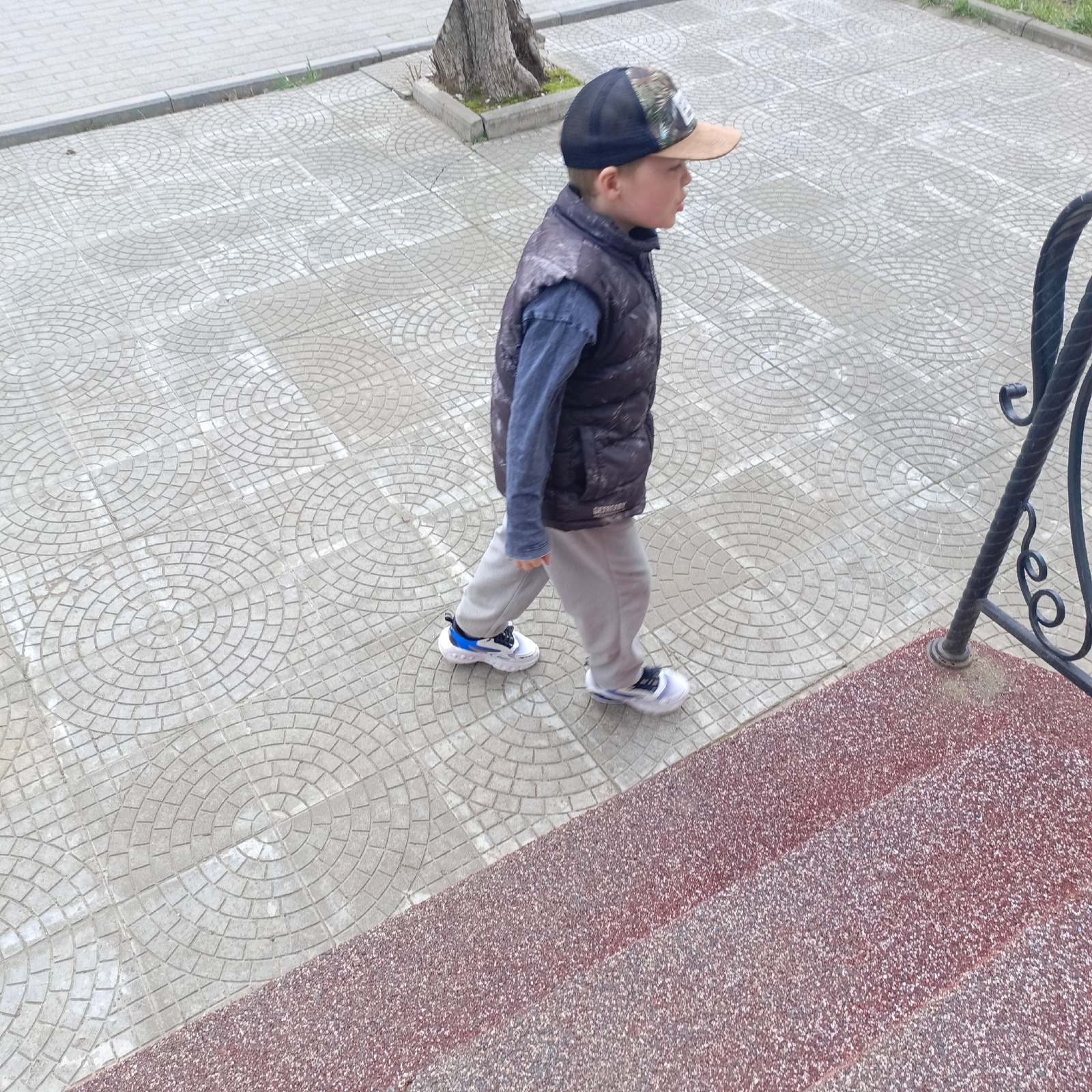 A child walks up outdoor steps in Unknown, Unknown. The child is wearing a baseball cap, a dark vest, a long-sleeved shirt, gray pants, and white sneakers with blue accents. The steps are made of a re…read more