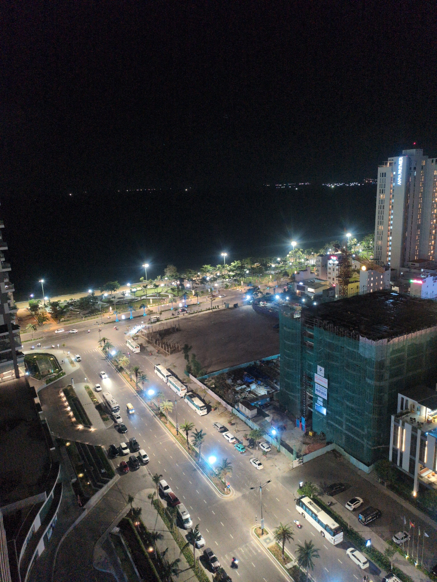 At night, the city of Quy Nhon Ward, Vietnam is photographed from above. The dark sea on the left contrasts with the lit coastline, where lights mark the road's edge and the adjacent buildings. Parall…read more