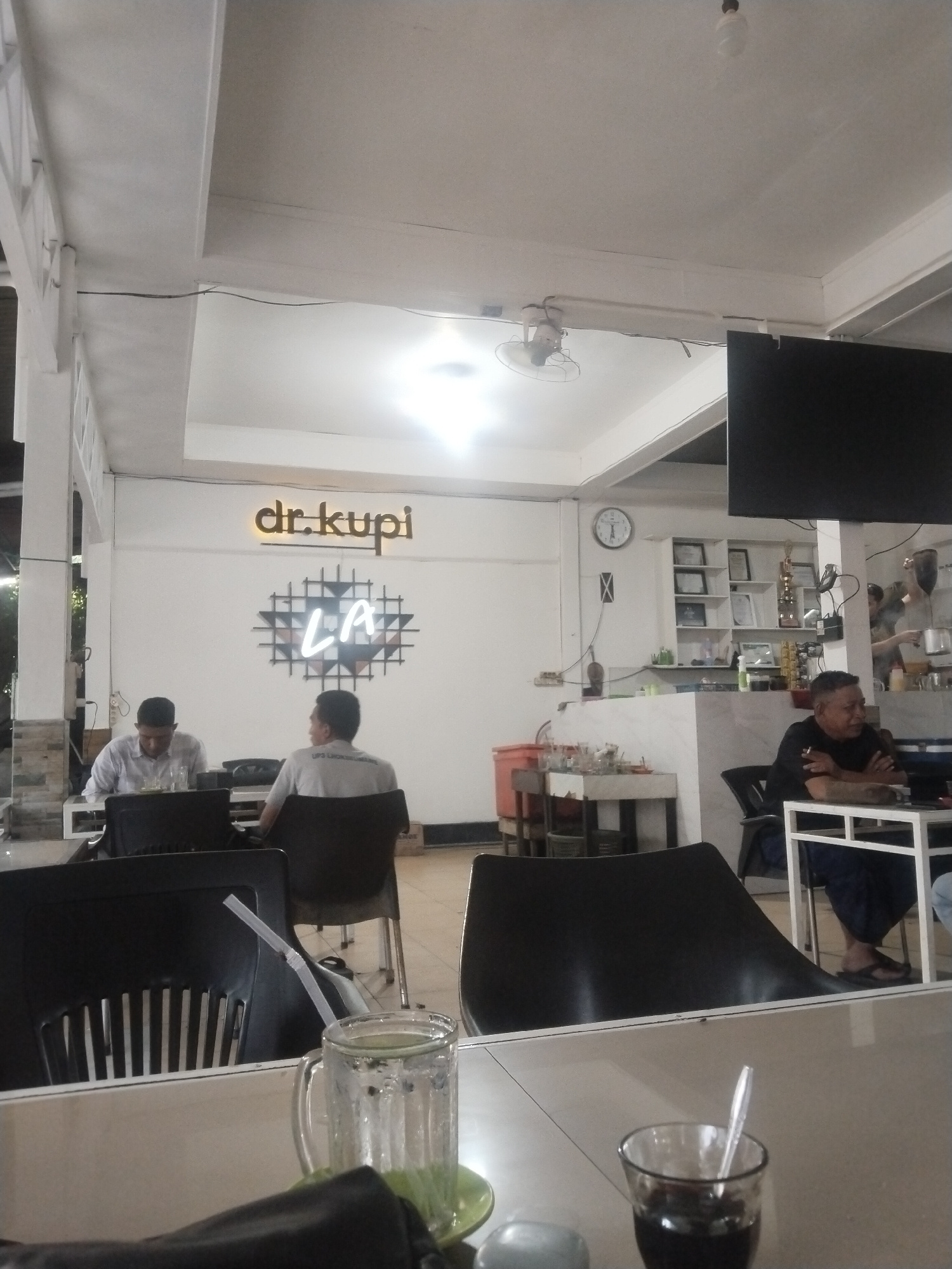 The image depicts the interior of "dr.kupi," a cafe located in Lhokseumawe, Indonesia. Three men are visible in the scene. Two men are seated at a table in the foreground, while a third man is seated…read more