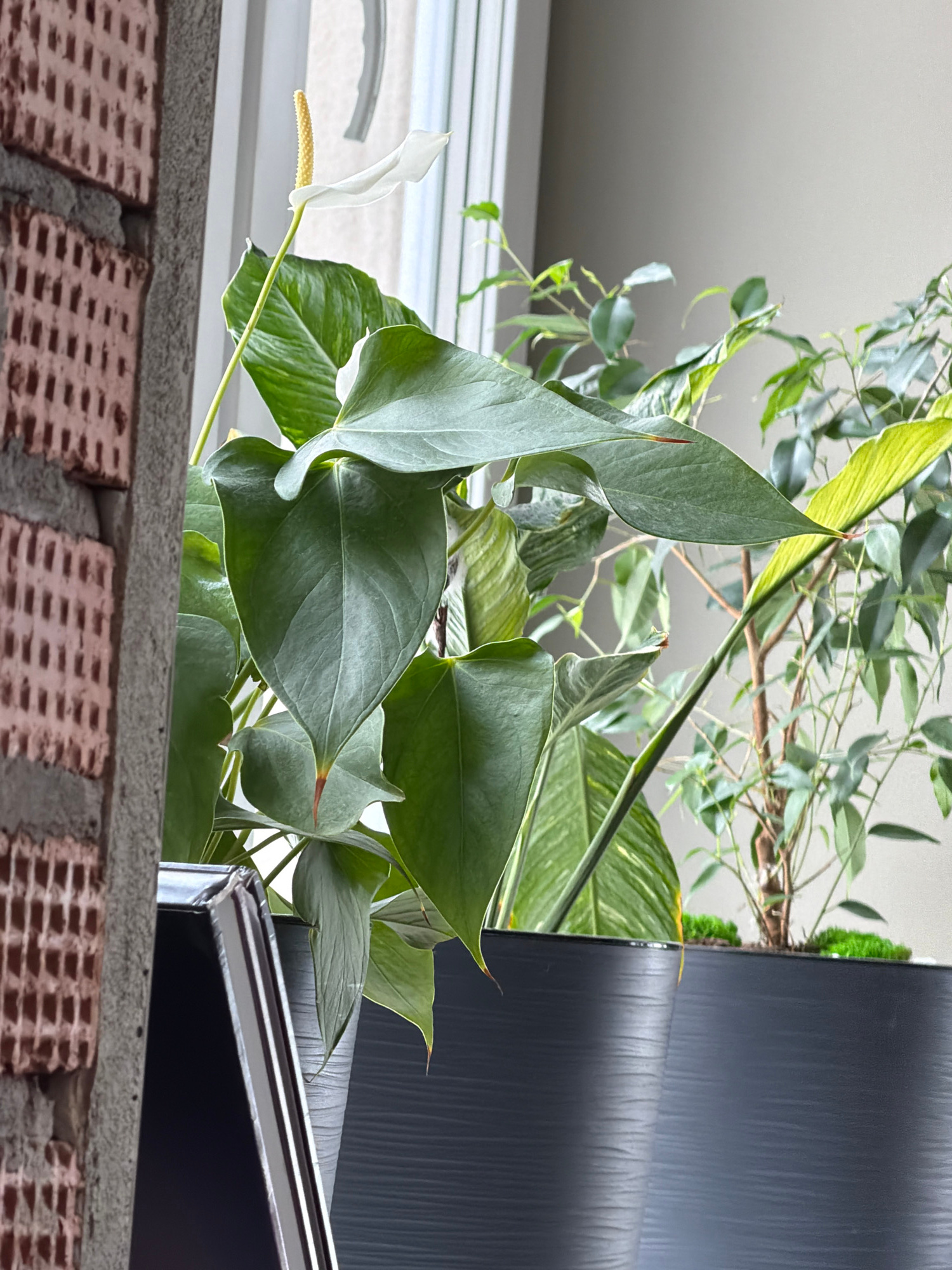 The image shows a close-up view of an indoor space in Pervomaysky, Russia, focusing on a brick ledge or shelf supporting several plants. The foreground consists of a section of a brick wall, partially…read more