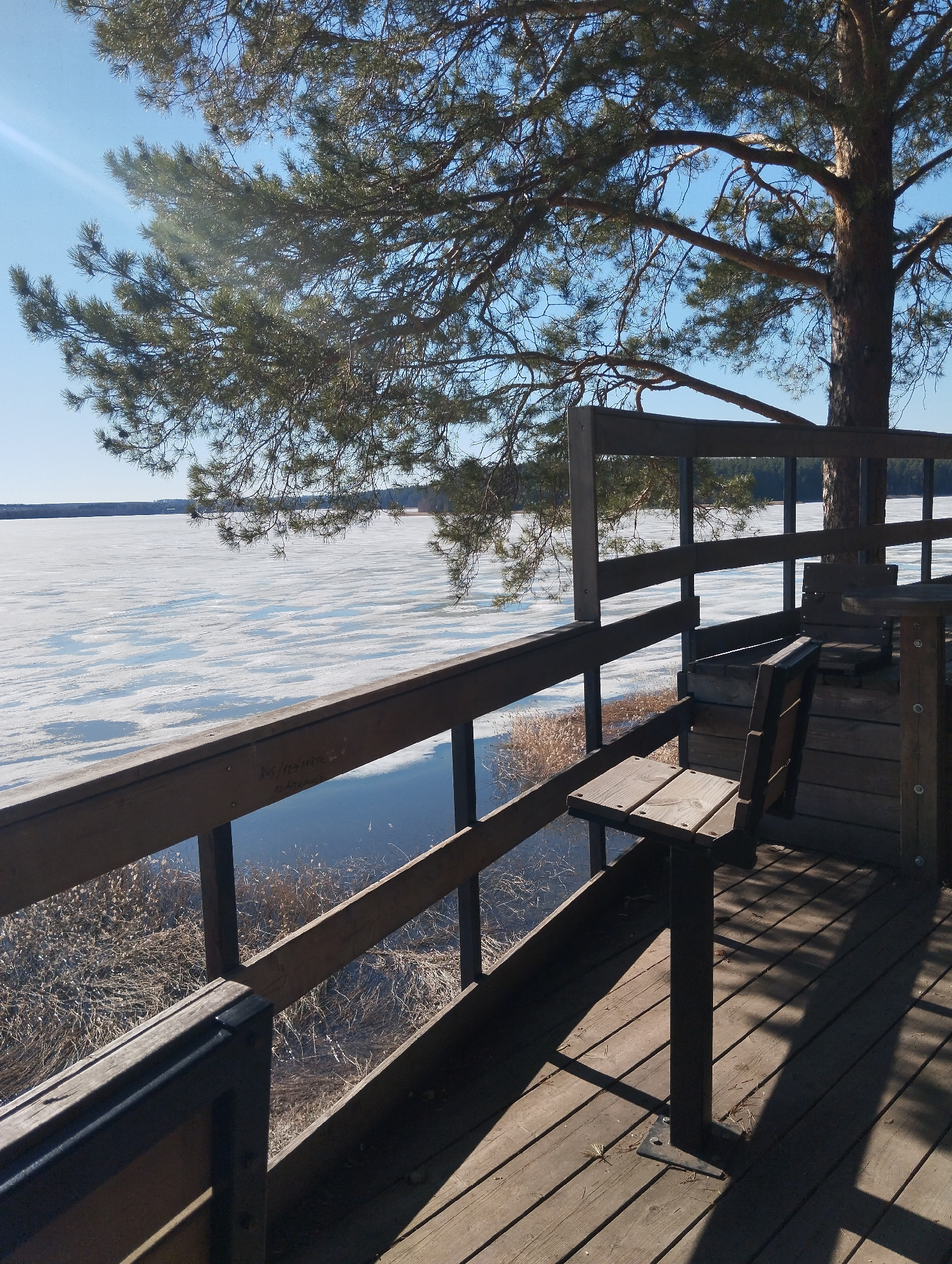 The image shows a wooden viewing platform overlooking a partially frozen lake in Votkinsk, Russia. The platform features a wooden railing, built-in seating, and a small table. A large pine tree grows…read more