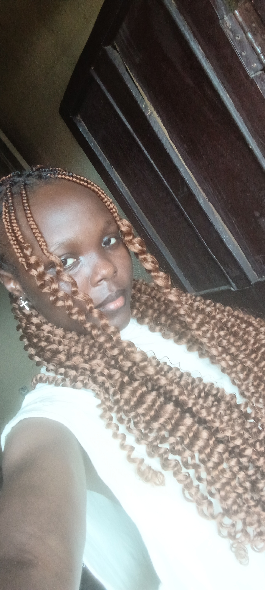 A close-up, slightly tilted portrait features a young woman with dark skin. Her hair is styled in long, voluminous, brown, curly braids that frame her face and extend down her chest. She wears a white…read more