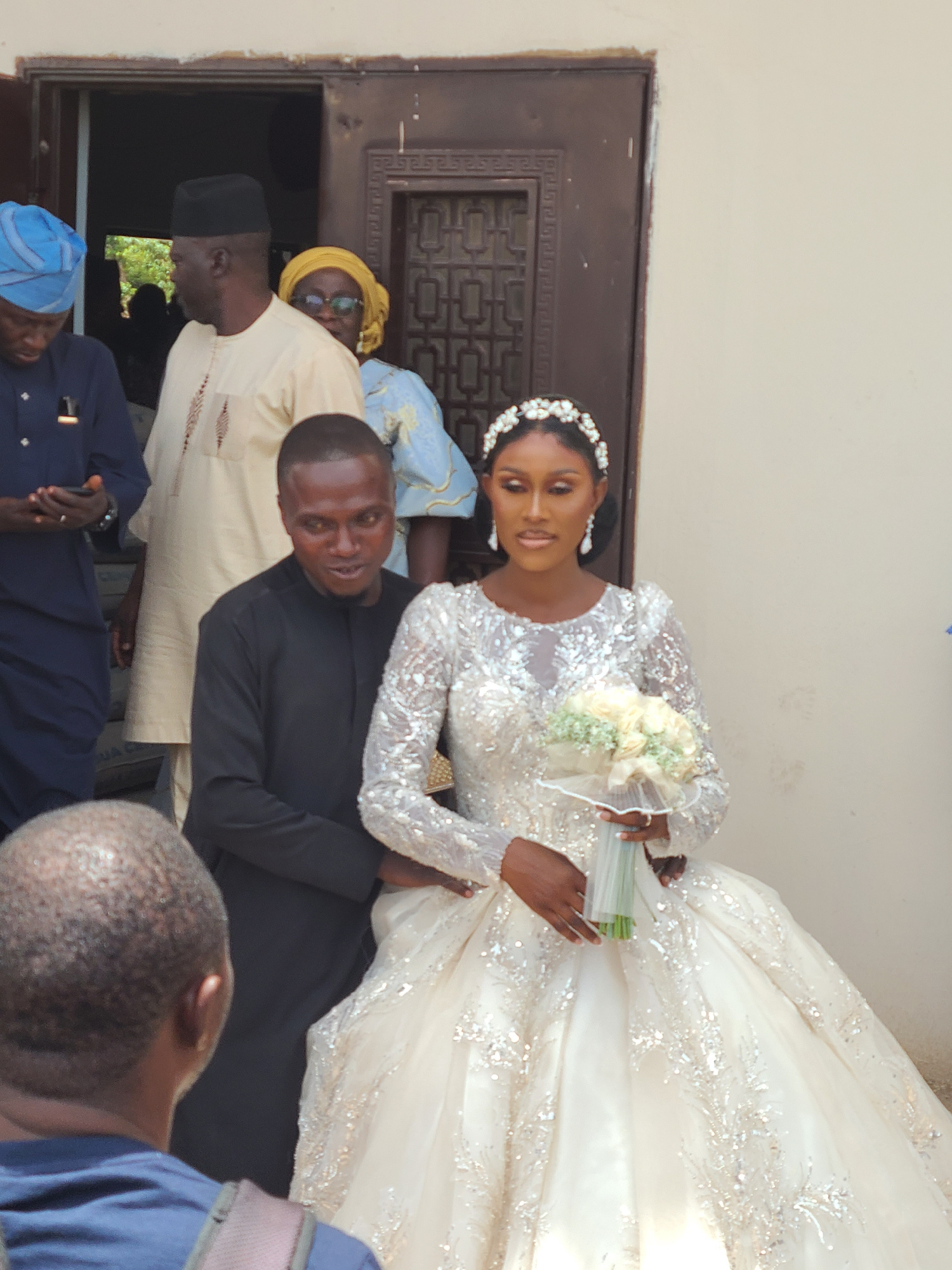 The image depicts a wedding scene. A bride in a white, long-sleeved gown, adorned with glitter, holds a bouquet of white flowers. She stands next to a man in a black shirt. Several other people are pr…read more