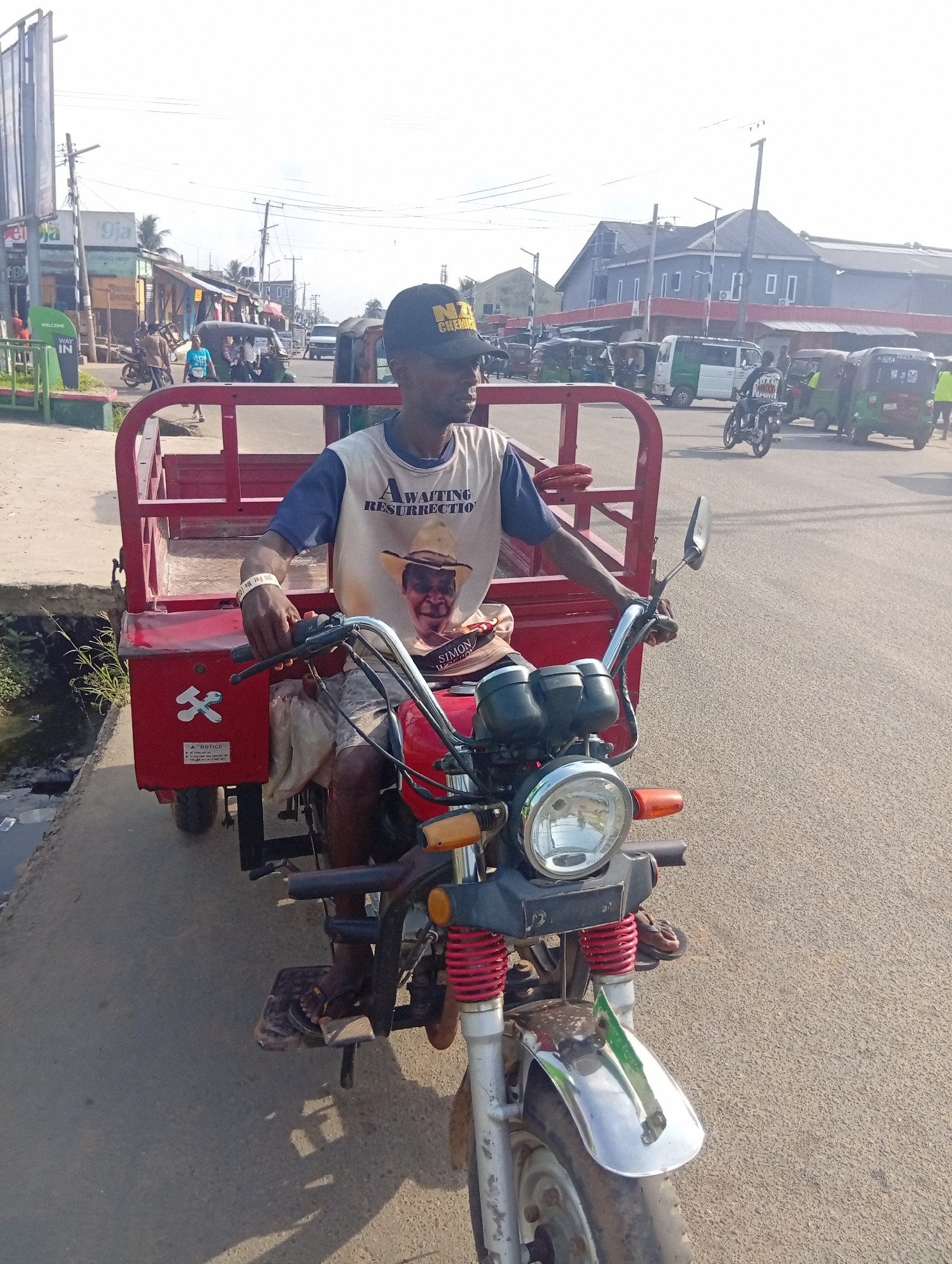 The image shows a man on a red three-wheeled motorcycle, known locally as a "Keke" or "Tricycle", in an urban setting. The man is wearing a black cap with yellow writing that appears to say "NA CHEMIS…read more