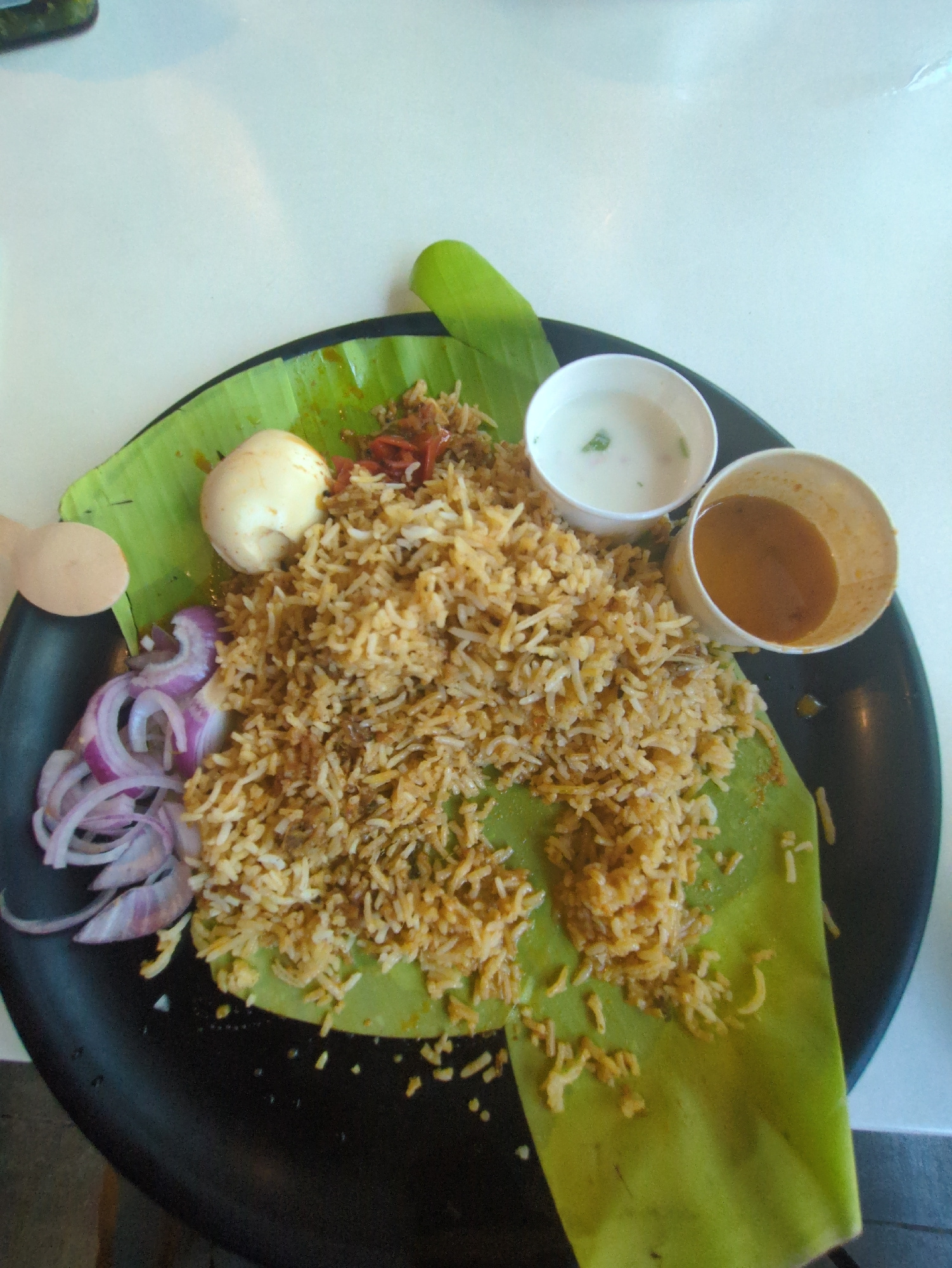 A high-angle, medium shot depicts a plate of food, specifically a biryani dish, likely taken at a restaurant in Bengaluru, India. The biryani, consisting of rice mixed with spices and possibly meat, i…read more