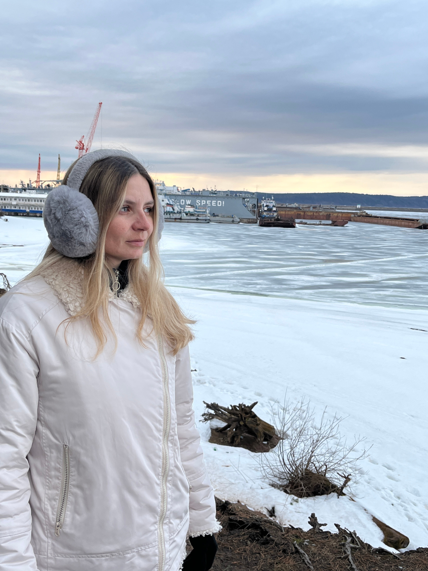 The photograph depicts a woman outdoors in winter. She is wearing a light-colored jacket and gray earmuffs. Behind her is a landscape covered in snow, a body of water, and industrial buildings, includ…read more