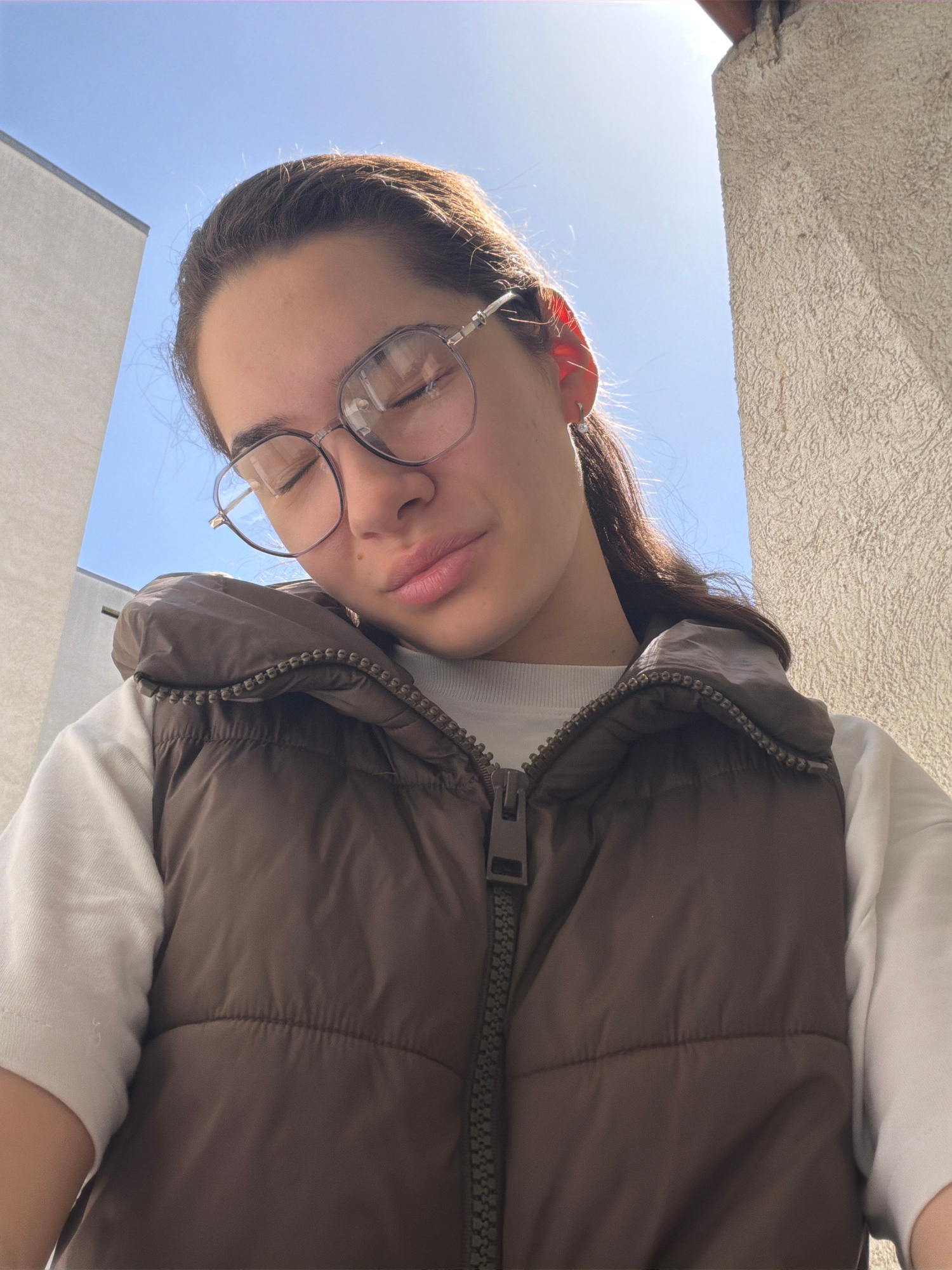 The image displays a low-angle portrait of a young person, rotated 90 degrees clockwise, with their head positioned towards the bottom-right of the frame. The subject is situated outdoors under a brig…read more