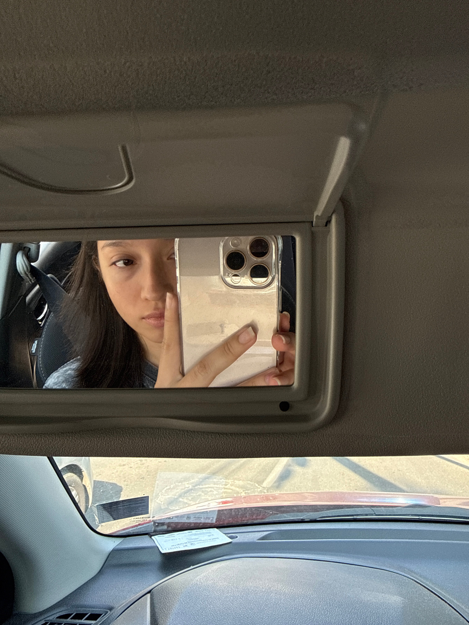 The image shows a selfie taken in the vanity mirror of a car sun visor. The reflected image includes the person taking the photo holding their phone, and their eye. The car's interior, specifically th…read more