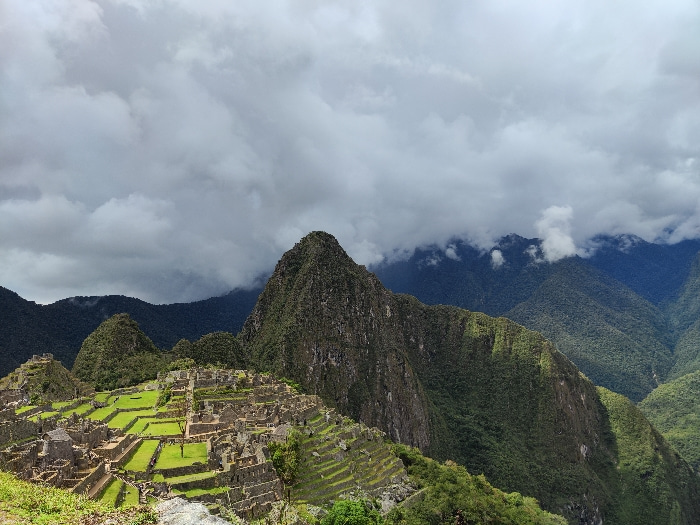 Machu Picchu ruins are nestled amongst verdant, terraced hillsides. Stone structures blend with the landscape, situated below a towering, jagged mountain peak. Lush, green mountain ranges stretch intoβ¦read more