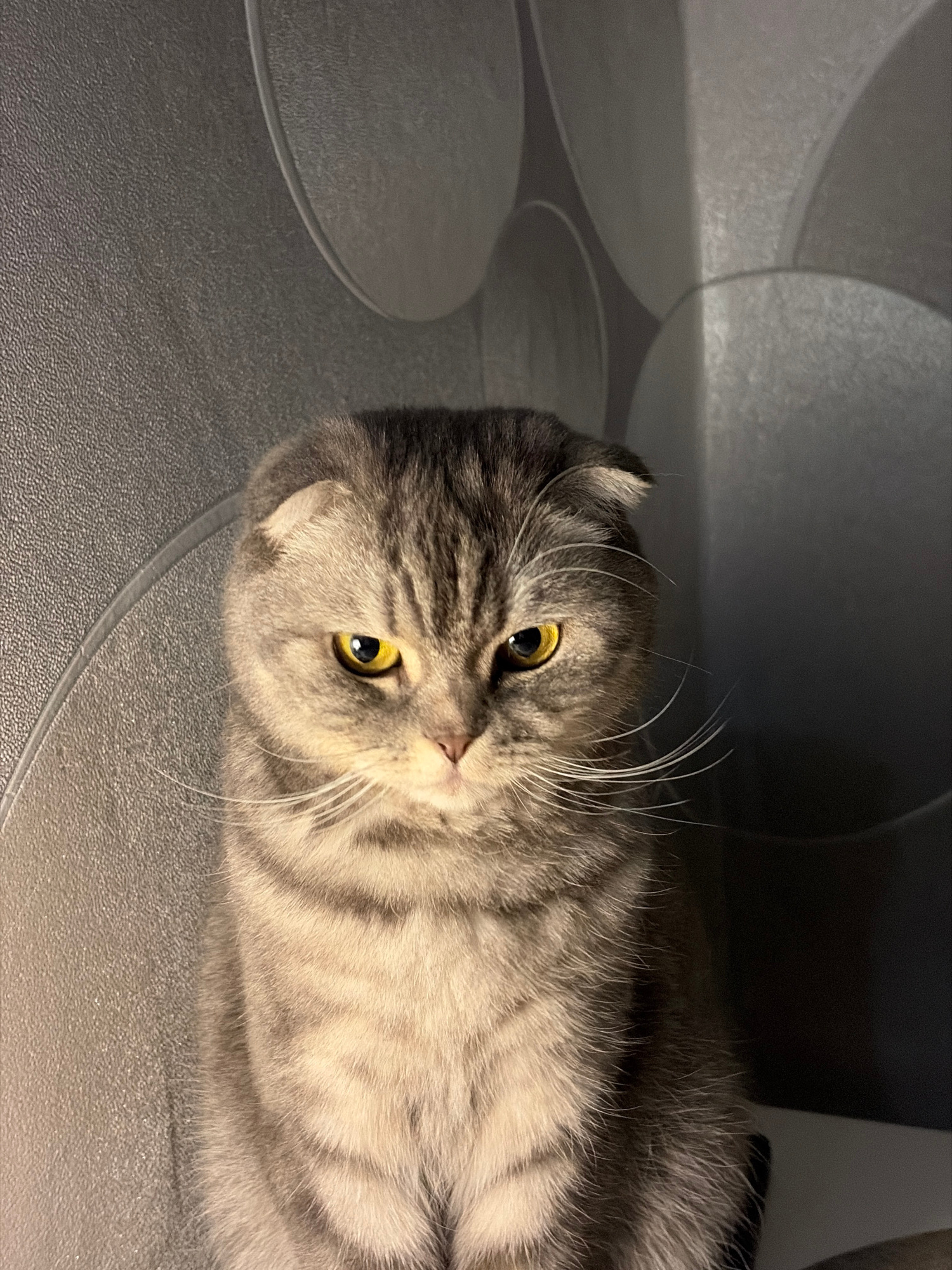 A gray tabby Scottish Fold cat with yellow eyes lies on a gray surface patterned with concentric circles. The cat is turned to the side, looking at the camera. Part of the cat is in shadow. No people…read more