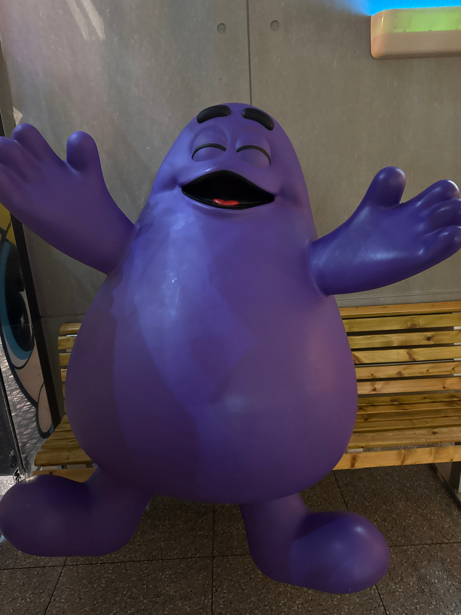 A high-angle shot presents a purple, cartoonish figure of an alien-like creature with visible hands and a large head, positioned on a patterned base or display platform. The setting appears to be indo…read more
