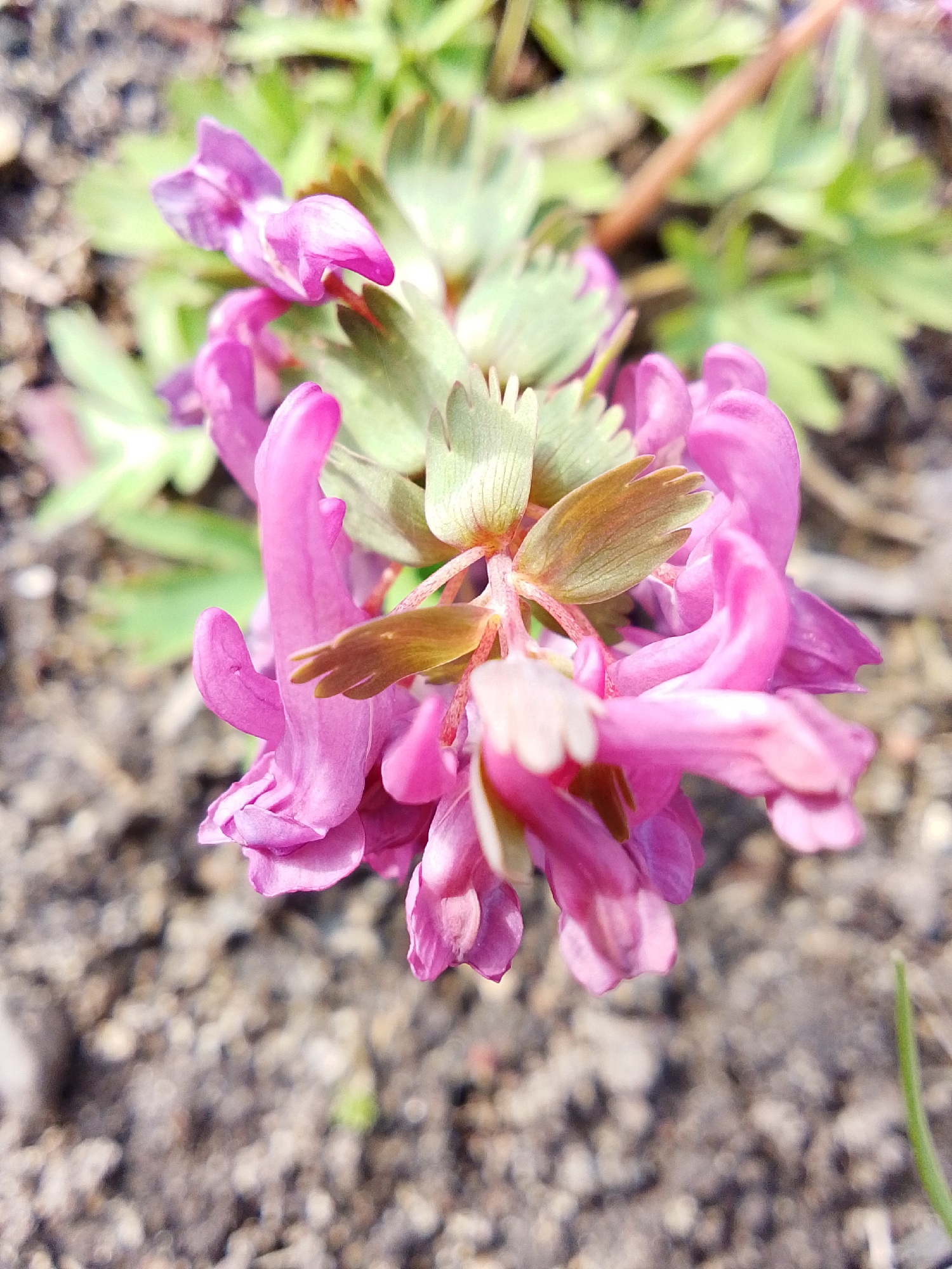The image provides a close-up, eye-level view of a cluster of vibrant pink and magenta flowers, likely a species of Corydalis due to their distinctive spurred, tubular shape. The flowers are the centr…read more