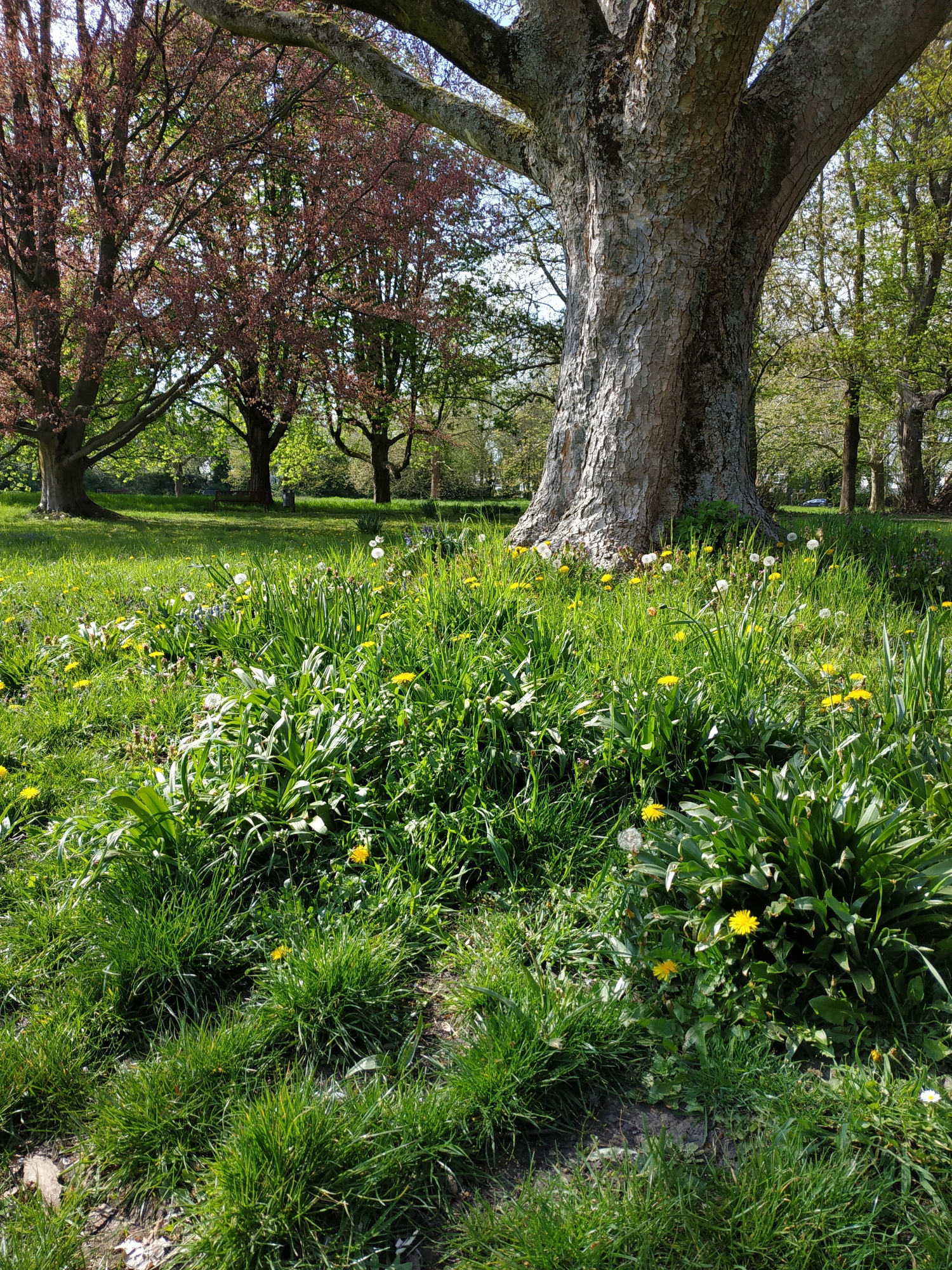 The image portrays a vibrant, sunlit park or natural landscape located in Dortmund, Germany. The scene is dominated by lush greenery and mature trees, suggesting a pleasant spring or early summer day.…read more